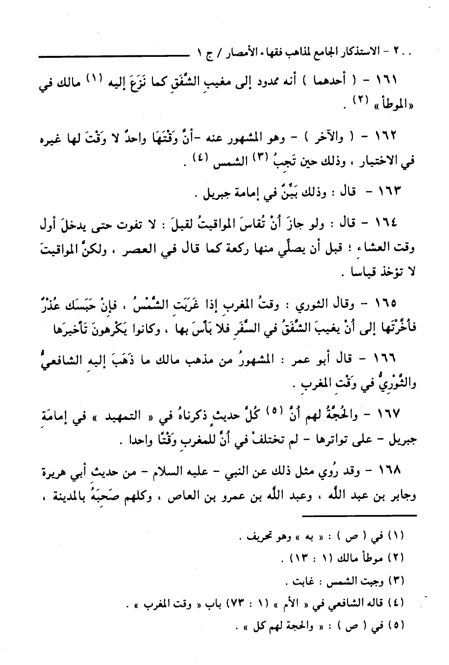 167 - قَالَ أَبُو عُمَرَ: الْمَشْهُورُ مِنْ مَذْهَبِ مَالِكٍ مَا ذَهَبَ إِلَيْهِ الشَّافِعِيُّ وَالثَّوْرِيُّ فِي وَقْتِ الْمَغْرِبِ.