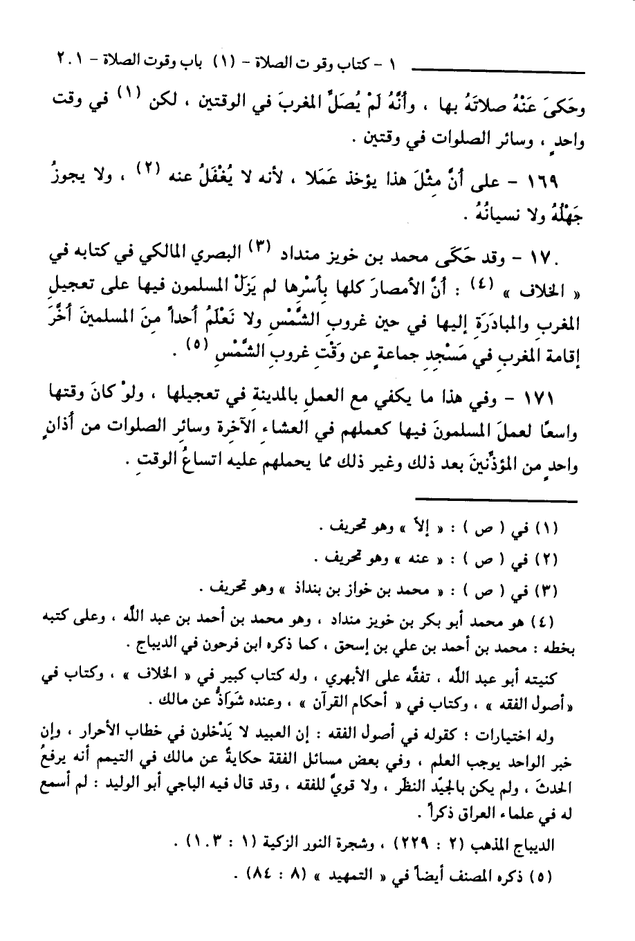 170 - وَقَدْ حَكَى مُحَمَّدُ بْنُ خُوَيْزِمَنْدَادَ الْبَصْرِيُّ الْمَالِكِيُّ فِي كِتَابِهِ فِي " الْخِلَافِ ": أَنَّ الْأَمْصَارَ كُلَّهَا بِأَسْرِهَا لَمْ يَزَلِ الْمُسْلِمُونَ فِيهَا عَلَى تَعْجِيلِ الْمَغْرِبِ وَالْمُبَادَرَةِ إِلَيْهَا فِي حِينِ غُرُوبِ الشَّمْسِ، وَلَا نَعْلَمُ أَحَدًا مِنَ الْمُسْلِمِينَ أَخَّرَ إِقَامَةَ الْمَغْرِبِ فِي مَسْجِدِ جَمَاعَةٍ عَنْ وَقْتِ غُرُوبِ الشَّمْسِ.