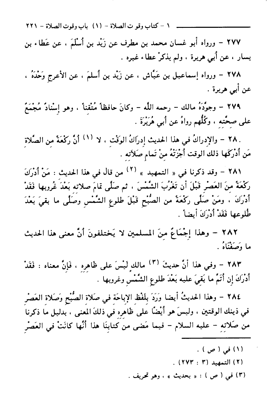 281 - وَقَدْ ذَكَرْنَا فِي " التَّمْهِيدِ " مَنْ قَالَ فِي هَذَا الْحَدِيثِ: مَنْ أَدْرَكَ رَكْعَةً مِنَ الْعَصْرِ قَبْلَ أَنْ تَغْرُبَ الشَّمْسُ، ثُمَّ صَلَّى تَمَامَ صَلَاتِهِ بَعْدَ غُرُوبِهَا فَقَدْ أَدْرَكَ، وَمَنْ صَلَّى رَكْعَةً مِنَ الصُّبْحِ قَبْلَ طُلُوعِ الشَّمْسِ وَصَلَّى مَا بَقِيَ بَعْدَ طُلُوعِهَا فَقَدْ أَدْرَكَ أَيْضًا.