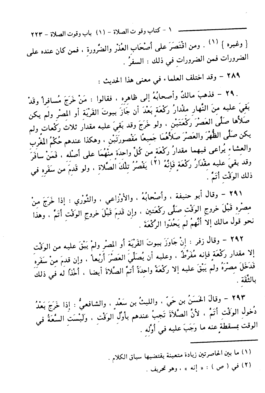 291 - وَقَالَ أَبُو حَنِيفَةَ، وَأَصْحَابُهُ، وَالْأَوْزَاعِيُّ، وَالثَّوْرِيُّ: إِذَا خَرَجَ مِنْ مِصْرِهِ قَبْلَ خُرُوجِ الْوَقْتِ صَلَّى رَكْعَتَيْنِ، وَإِنْ قَدِمَ قَبْلَ خُرُوجِ الْوَقْتِ أَتَمَّ، وَهَذَا نَحْوُ قَوْلِ مَالِكٍ إِلَّا أَنَّهُمْ لَمْ يَحُدُّوا الرَّكْعَةَ.