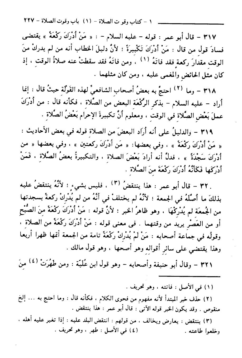 320 - قَالَ أَبُو عُمَرُ: هَذَا يَنْتَقِضُ فَلَيْسَ بِشَيْءٍ ; لِأَنَّهُ يَنْتَقِضُ عَلَيْهِ بِذَلِكَ مَا أَصَّلَهُ فِي الْجُمُعَةِ ; لِأَنَّهُ لَمْ يُخْتَلَفْ فِي أَنَّهُ مَنْ لَمْ يُدْرِكْ رَكْعَةً بِسَجْدَتِهَا مِنَ الْجُمُعَةِ لَمْ يُدْرِكْهَا، وَهُوَ ظَاهِرُ الْخَبَرِ ; لِأَنَّ قَوْلَهُ: مَنْ أَدْرَكَ رَكْعَةً مِنَ الصُّبْحِ أَوْ مِنَ الْعَصْرِ يُرِيدُ مِنْ وَقْتِهِمَا. فِي مَعْنَى قَوْلِهِ: مَنْ أَدْرَكَ رَكْعَةً مِنَ الصَّلَاةِ، وَقَوْلُهُ فِي جَمَاعَةِ أَصْحَابِهِ: مَنْ لَمْ يُدْرِكْ رَكْعَةً تَامَّةً مِنَ الْجُمُعَةِ أَتَمَّهَا ظُهْرًا أَرْبَعًا وَهَذَا يَقْتَضِي عَلَى سَائِرِ أَقْوَالِهِ وَهُوَ أَصَحُّهَا، وَهُوَ قَوْلُ مَالِكٍ.