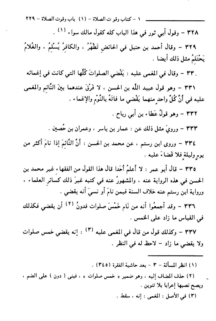 335 - قَالَ أَبُو عُمَرَ: لَا أَعْلَمُ أَحَدًا قَالَ هَذَا الْقَوْلَ مِنَ الْفُقَهَاءِ غَيْرَ مُحَمَّدِ بْنِ الْحَسَنِ فِي هَذِهِ الرِّوَايَةِ عَنْهُ، وَالْمَشْهُورُ عَنْهُ فِي كُتُبِهِ غَيْرُ ذَلِكَ كَسَائِرِ الْعُلَمَاءِ، وَرِوَايَةُ ابْنِ رُسْتُمَ عَنْهُ خِلَافُ السُّنَّةِ فِيمَنْ نَامَ أَوْ نَسِيَ أَنَّهُ يَقْضِي.
