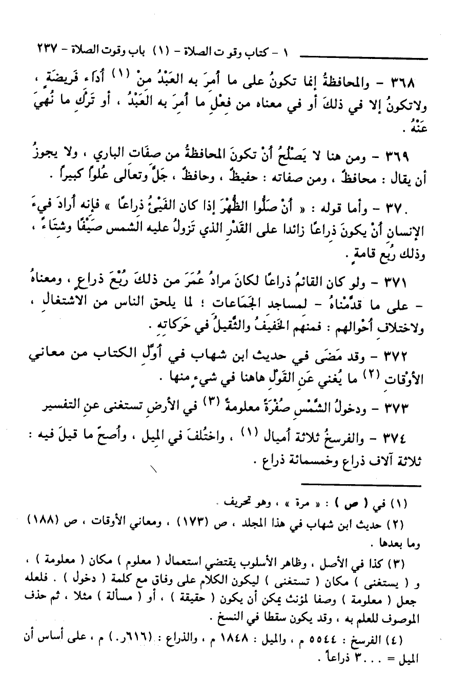 370 - وَأَمَّا قَوْلُهُ: " أَنْ صَلُّوا الظُّهْرَ إِذَا كَانَ الْفَيْءُ ذِرَاعًا " فَإِنَّهُ أَرَادَ فَيْءَ الْإِنْسَانِ أَنْ يَكُونَ ذِرَاعًا زَائِدًا عَلَى الْقَدْرِ الَّذِي تَزُولُ عَلَيْهِ الشَّمْسُ صَيْفًا وَشِتَاءً، وَذَلِكَ رُبْعُ قَامَةٍ.