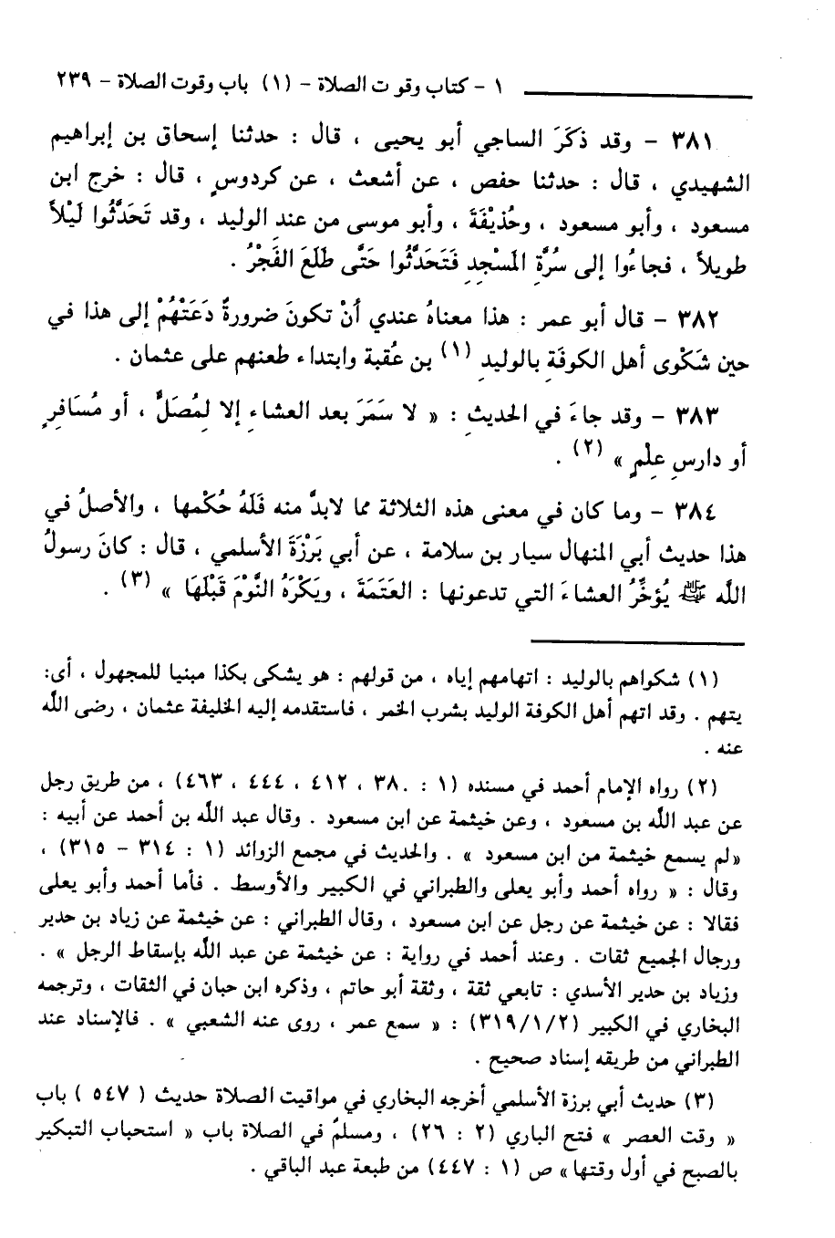 383 - وَقَدْ جَاءَ فِي الْحَدِيثِ: " لَا سَمَرَ بَعْدَ الْعِشَاءِ إِلَّا لِمُصَلٍّ، أَوْ مُسَافِرٍ، أَوْ دَارِسِ عِلْمٍ ".