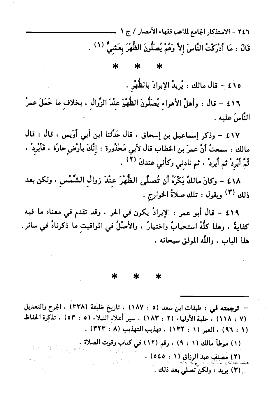 418 - وَكَانَ مَالِكٌ يَكْرَهُ أَنْ تُصَلَّى الظُّهْرُ عِنْدَ زَوَالِ الشَّمْسِ، وَلَكِنْ بَعْدَ ذَلِكَ وَيَقُولُ: تِلْكَ صَلَاةُ الْخَوَارِجِ.