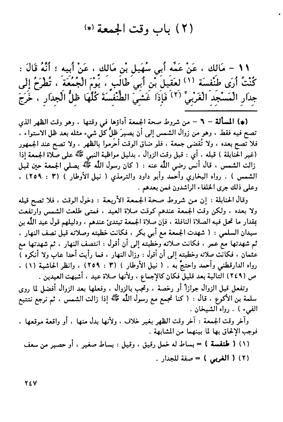 11 - مَالِكٌ، عَنْ عَمِّهِ أَبِي سُهَيْلِ بْنِ مَالِكٍ، عَنْ أَبِيهِ أَنَّهُ قَالَ: كُنْتُ أَرَى طِنْفِسَةً لِعَقِيلِ بْنِ أَبِي طَالِبٍ، يَوْمَ الْجُمُعَةِ، تُطْرَحُ إِلَى جِدَارِ الْمَسْجِدِ الْغَرْبِيِّ، فَإِذَا غَشِيَ الطِّنْفِسَةَ كُلَّهَا ظِلُّ الْجِدَارِ، خَرَجَ