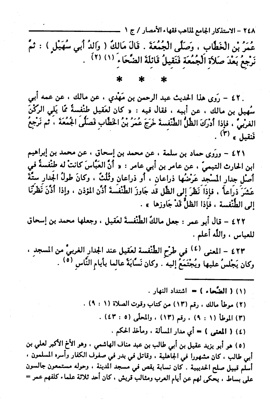 عُمَرُ بْنُ الْخَطَّابِ، وَصَلَّى الْجُمُعَةَ. قَالَ مَالِكٌ ( وَالِدُ أَبِي سُهَيْلٍ ): ثُمَّ نَرْجِعُ بَعْدَ صَلَاةِ الْجُمُعَةِ فَنَقِيلُ قَائِلَةَ الضَّحَاءِ.