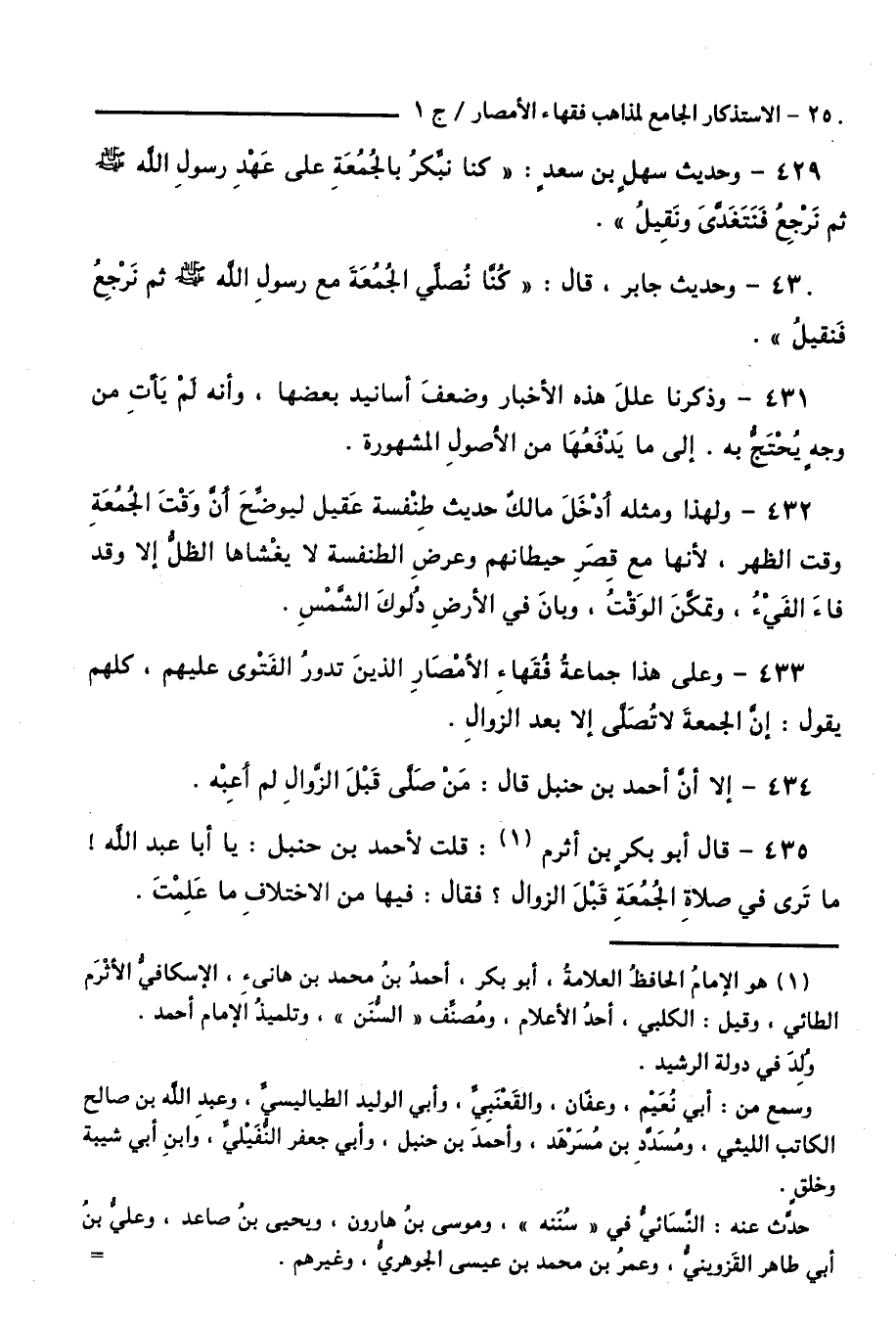 433 - وَعَلَى هَذَا جَمَاعَةُ فُقَهَاءِ الْأَمْصَارِ الَّذِينَ تَدُورُ الْفَتْوَى عَلَيْهِمْ، كُلُّهُمْ يَقُولُ: إِنَّ الْجُمُعَةَ لَا تُصَلَّى إِلَّا بَعْدَ الزَّوَالِ.