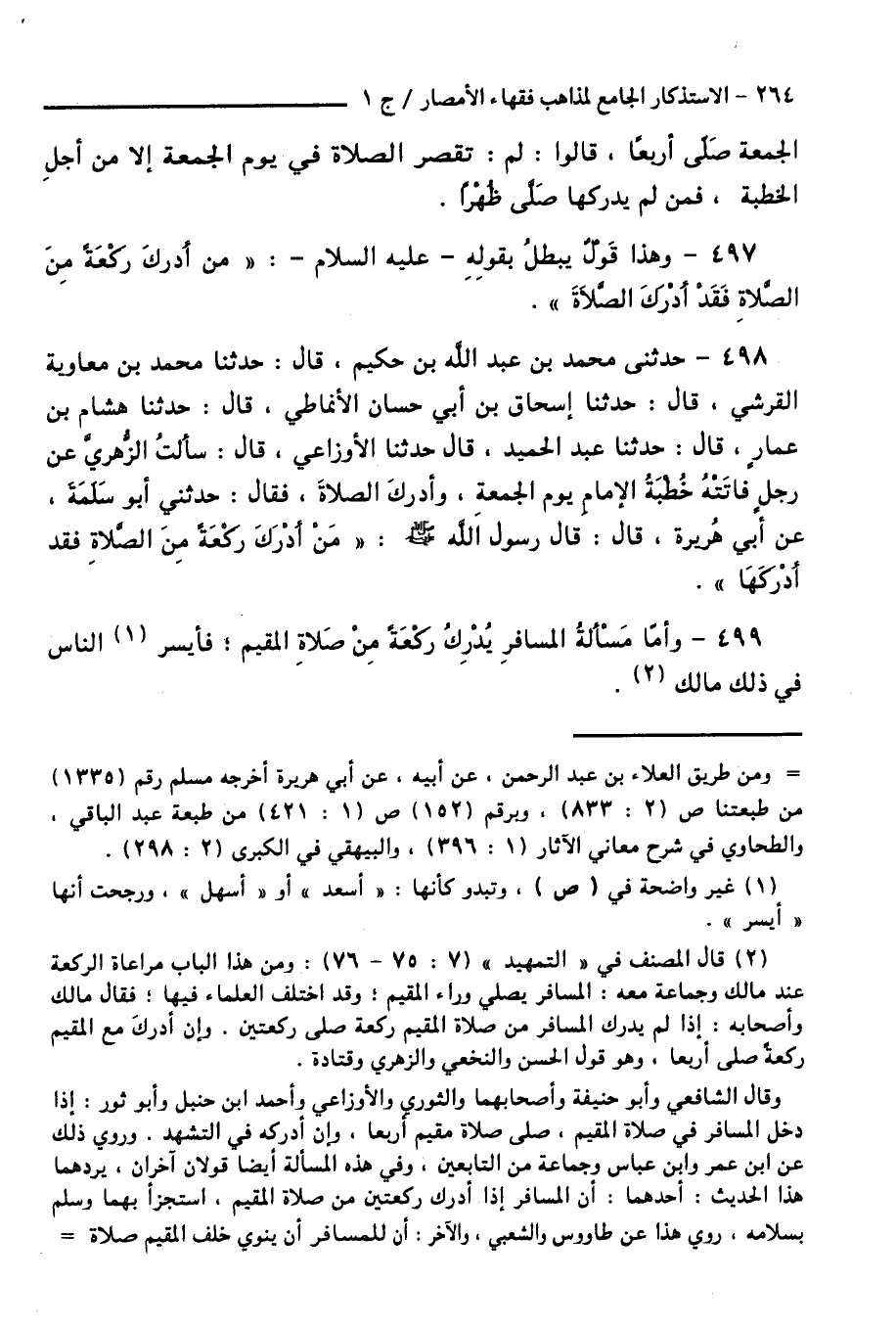 499 - وَأَمَّا مَسْأَلَةُ الْمُسَافِرِ يُدْرِكُ رَكْعَةً مِنْ صَلَاةِ الْمُقِيمِ، فَأَيْسَرُ النَّاسِ فِي ذَلِكَ مَالِكٌ.