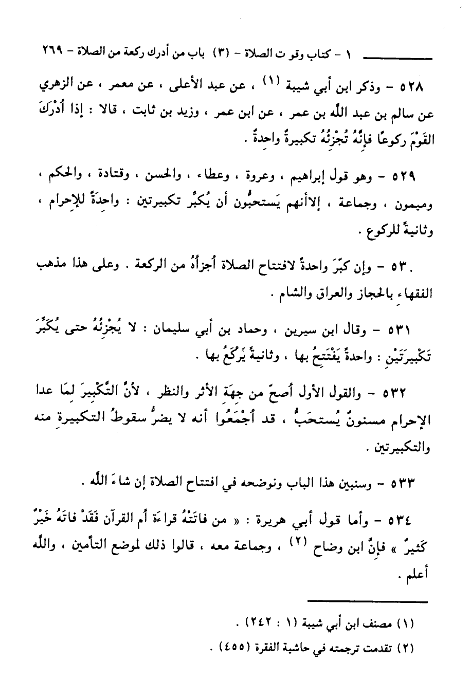 530 - وَإِنْ كَبَّرَ وَاحِدَةً لِافْتِتَاحِ الصَّلَاةِ أَجْزَأَهُ مِنَ الرَّكْعَةِ، وَعَلَى هَذَا مَذْهَبُ الْفُقَهَاءِ بِالْحِجَازِ وَالْعِرَاقِ وَالشَّامِ.