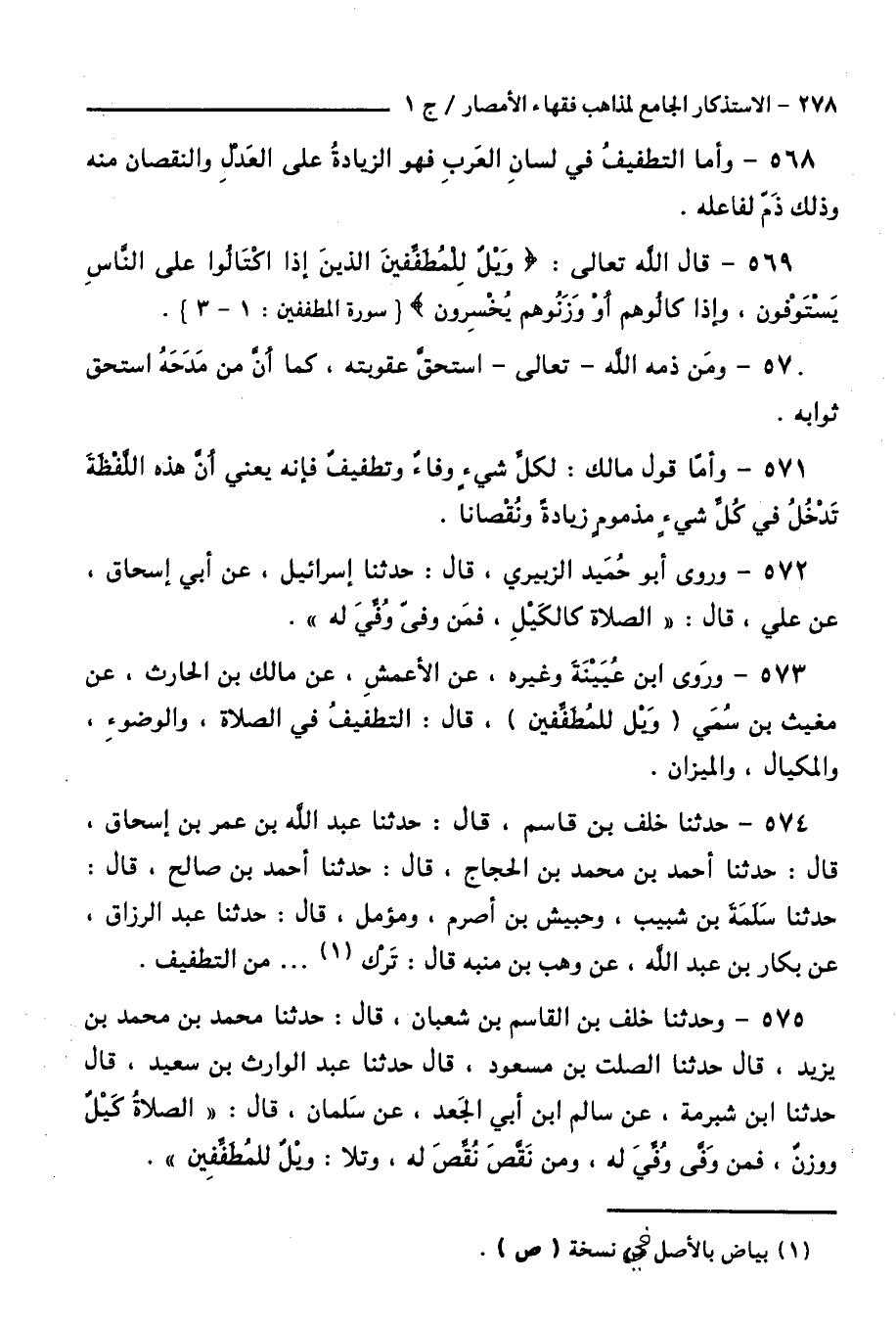 571 - وَأَمَّا قَوْلُ مَالِكٍ: لِكُلِّ شَيْءٍ وَفَاءٌ وَتَطْفِيفٌ، فَإِنَّهُ يَعْنِي أَنَّ هَذِهِ اللَّفْظَةَ تَدْخُلُ فِي كُلِّ شَيْءٍ مَذْمُومٍ زِيَادَةً وَنُقْصَانًا.