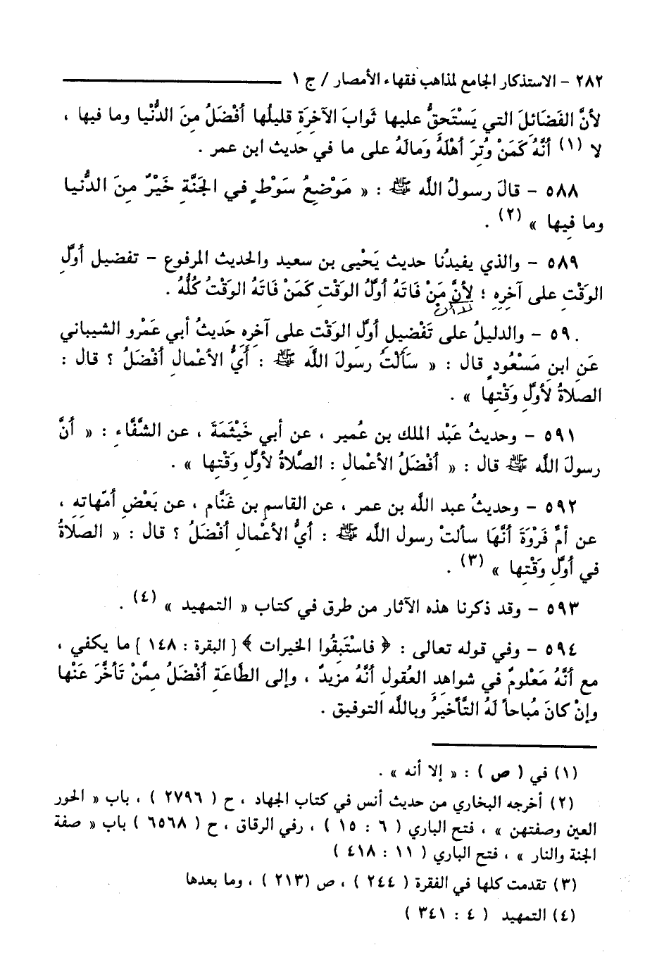 589 - وَالَّذِي يُفِيدُنَا حَدِيثُ يَحْيَى بْنِ سَعِيدٍ وَالْحَدِيثُ الْمَرْفُوعُ - تَفْضِيلُ أَوَّلِ الْوَقْتِ عَلَى آخِرِهِ ; لِأَنَّ مَنْ فَاتَهُ أَوَّلُ الْوَقْتِ فَاتَهُ كَمَنْ فَاتَهُ الْوَقْتُ كُلُّهُ.