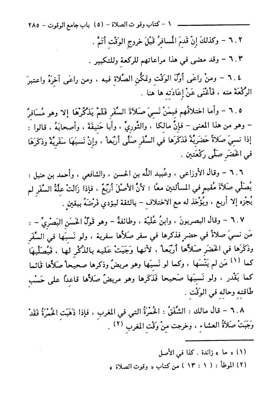 606 - وَقَالَ الْأَوْزَاعِيُّ، وَعُبَيْدُ اللَّهِ بْنُ الْحَسَنِ، وَالشَّافِعِيُّ، وَأَحْمَدُ بْنُ حَنْبَلٍ: يُصَلِّي صَلَاةَ مُقِيمٍ فِي الْمَسْأَلَتَيْنِ مَعًا ; لِأَنَّ الْأَصْلَ أَرْبَعٌ، فَإِذَا زَالَتْ عِلَّةُ السَّفَرِ لَمْ يُجِزْهُ إِلَّا أَرْبَعٌ، وَيُؤْخَذُ لَهُ مَعَ الِاخْتِلَافِ بِالثِّقَةِ لِيُؤَدِّيَ فَرْضَهُ بِيَقِينٍ.
