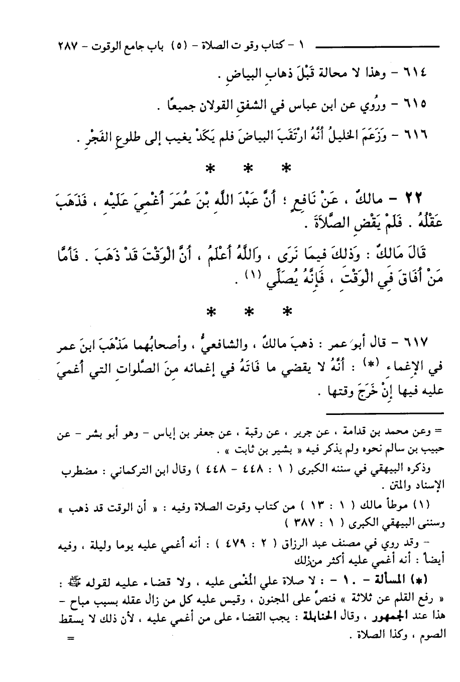 22 - مَالِكٌ، عَنْ نَافِعٍ: أَنَّ عَبْدَ اللَّهِ بْنَ عُمَرَ أُغْمِيَ عَلَيْهِ، فَذَهَبَ عَقْلُهُ، فَلَمْ يَقْضِ الصَّلَاةَ.