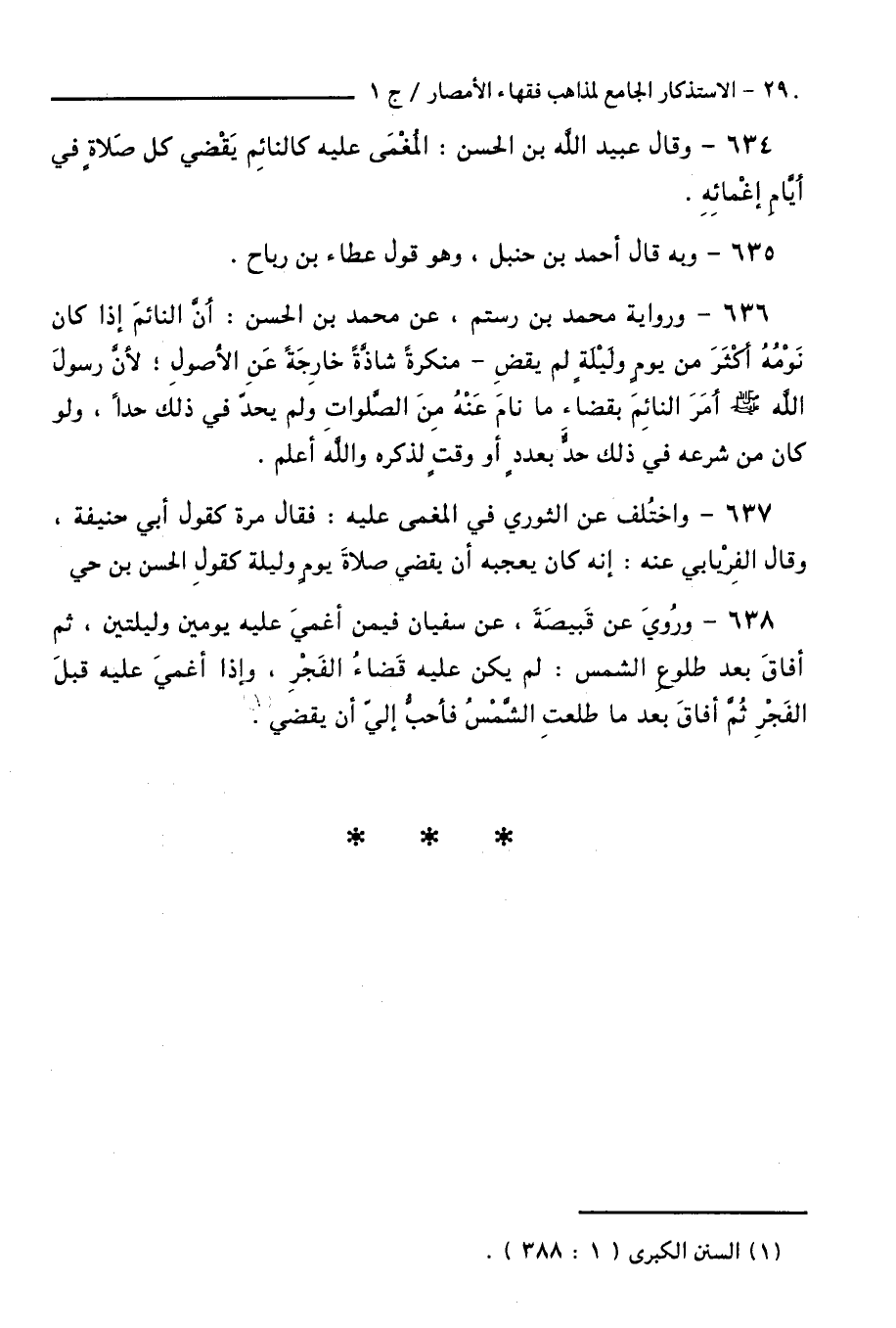 634 - وَقَالَ عُبَيْدُ اللَّهِ بْنُ الْحَسَنِ: الْمُغْمَى عَلَيْهِ كَالنَّائِمِ يَقْضِي كُلَّ صَلَاةٍ فِي أَيَّامِ إِغْمَائِهِ.
