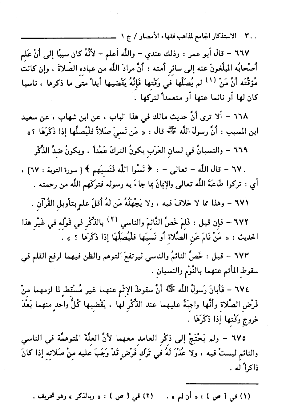 668 - أَلَا تَرَى أَنَّ حَدِيثَ مَالِكٍ فِي هَذَا الْبَابِ، عَنِ ابْنِ شِهَابٍ، عَنْ سَعِيدِ بْنِ الْمُسَيَّبِ: أَنَّ رَسُولَ اللَّهِ - صَلَّى اللَّهُ عَلَيْهِ وَسَلَّمَ - قَالَ: "مَنْ نَسِيَ صَلَاةً فَلْيُصَلِّهَا إِذَا ذَكَرَهَا ".