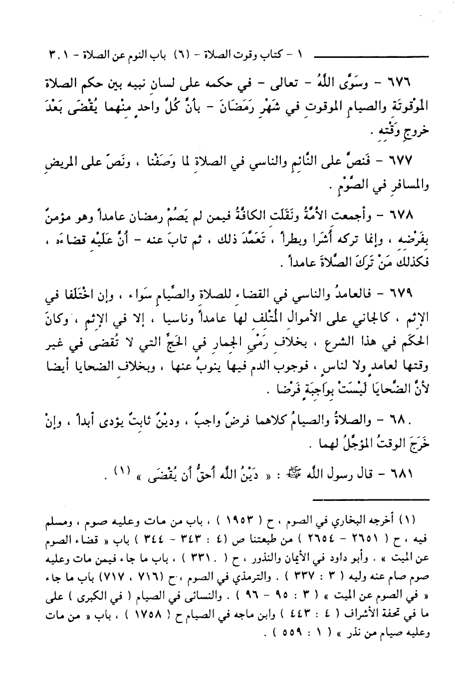 676 - وَسَوَّى اللَّهُ - تَعَالَى - فِي حُكْمِهِ عَلَى لِسَانِ نَبِيِّهِ بَيْنَ حُكْمِ الصَّلَاةِ الْمَوْقُوتَةِ وَالصِّيَامِ الْمَوْقُوتِ فِي شَهْرِ رَمَضَانَ - بِأَنَّ كُلَّ وَاحِدٍ مِنْهُمَا يُقْضَى بَعْدَ خُرُوجِ وَقْتِهِ.
