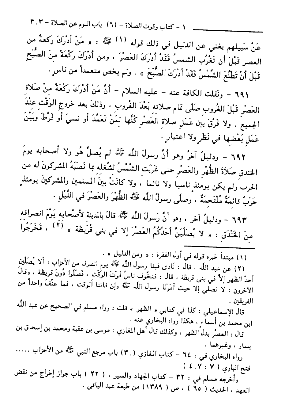 691 - وَنَقَلَتِ الْكَافَّةُ عَنْهُ - عَلَيْهِ السَّلَامُ - أَنَّ مَنْ أَدْرَكَ رَكْعَةً مِنْ صَلَاةِ الْعَصْرِ قَبْلَ الْغُرُوبِ صَلَّى تَمَامَ صَلَاتِهِ بَعْدَ الْغُرُوبِ، وَذَلِكَ بَعْدَ خُرُوجِ الْوَقْتِ عِنْدَ الْجَمِيعِ، وَلَا فَرْقَ بَيْنَ عَمَلِ صَلَاةِ الْعَصْرِ كُلِّهَا لِمَنْ تَعَمَّدَ أَوْ نَسِيَ أَوْ فَرَّطَ، وَبَيْنَ عَمَلِ بَعْضِهَا فِي نَظَرٍ وَلَا اعْتِبَارٍ.