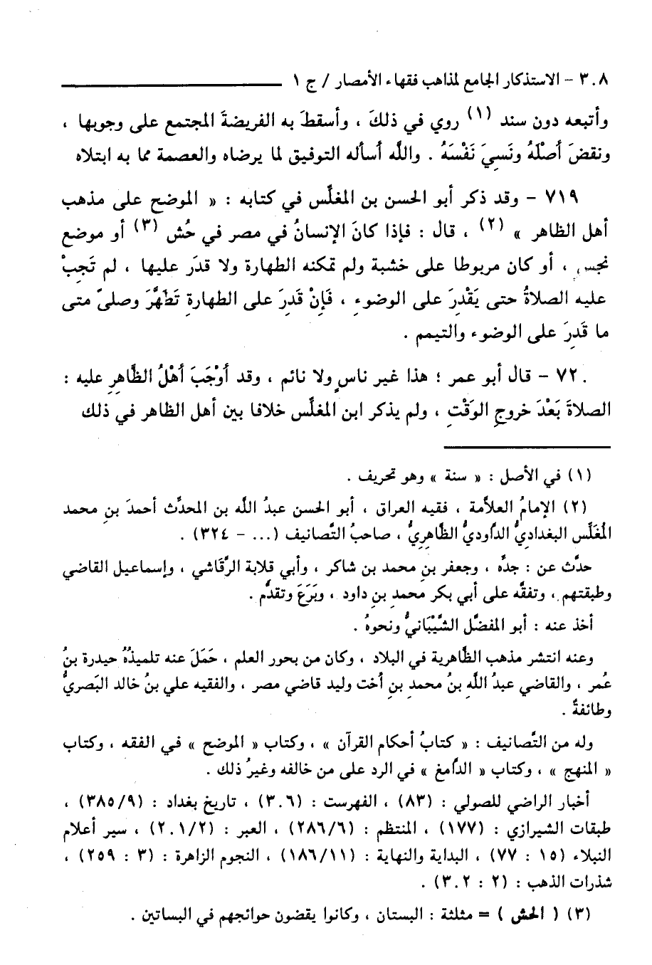 719 - وَقَدْ ذَكَرَ أَبُو الْحَسَنِ بْنُ الْمُغَلِّسِ فِي كِتَابِهِ: " الْمُوَضَّحِ عَلَى مَذْهَبِ أَهْلِ الظَّاهِرِ " قَالَ: فَإِذَا كَانَ الْإِنْسَانُ فِي مِصْرٍ فِي حَشٍّ أَوْ مَوْضِعٍ نَجِسٍ، أَوْ كَانَ مَرْبُوطًا عَلَى خَشَبَةٍ وَلَمْ تُمْكِنْهُ الطَّهَارَةُ وَلَا قَدَرَ عَلَيْهَا، لَمْ تَجِبْ عَلَيْهِ الصَّلَاةُ حَتَّى يَقْدِرَ عَلَى الْوُضُوءِ، فَإِنْ قَدَرَ عَلَى الطَّهَارَةِ تَطَهَّرَ وَصَلَّى مَتَى مَا قَدَرَ عَلَى الْوُضُوءِ وَالتَّيَمُّمِ.