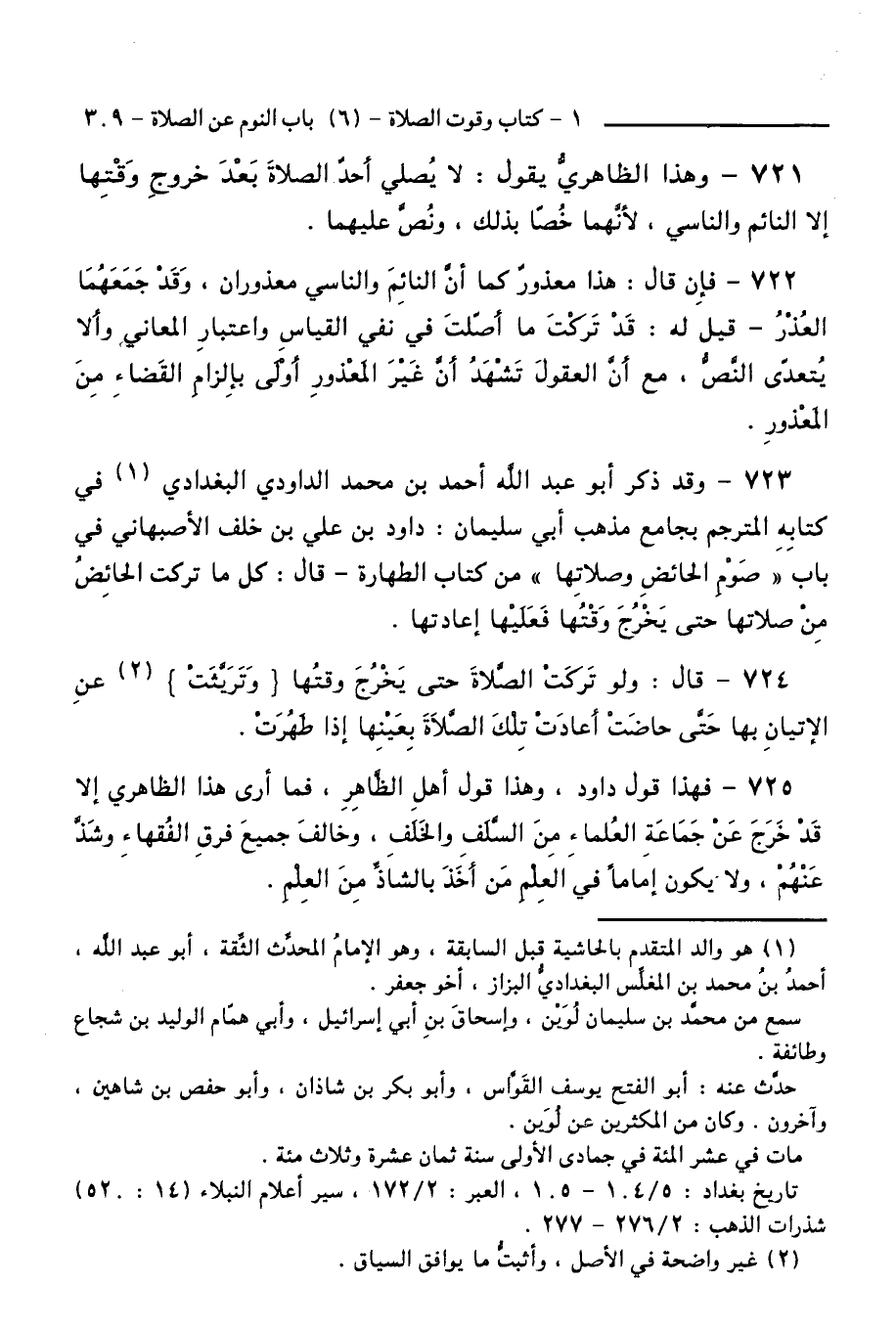 723 - وَقَدْ ذَكَرَ أَبُو عَبْدِ اللَّهِ أَحْمَدُ بْنُ مُحَمَّدٍ الدَاوُدِيُّ الْبَغْدَادِيُّ فِي كِتَابِهِ الْمُتَرْجِمِ بِجَامِعِ مَذْهَبِ أَبِي سُلَيْمَانَ: دَاوُدَ بْنِ عَلِيِّ بْنِ خَلَفٍ الْأَصْبَهَانِيِّ فِي بَابِ " صَوْمِ الْحَائِضِ وَصَلَاتِهَا " مِنْ كِتَابِ الطَّهَارَةِ - قَالَ: كُلُّ مَا تَرَكَتِ الْحَائِضُ مِنْ صَلَاتِهَا حَتَّى يَخْرُجَ وَقْتُهَا فَعَلَيْهَا إِعَادَتُهَا.