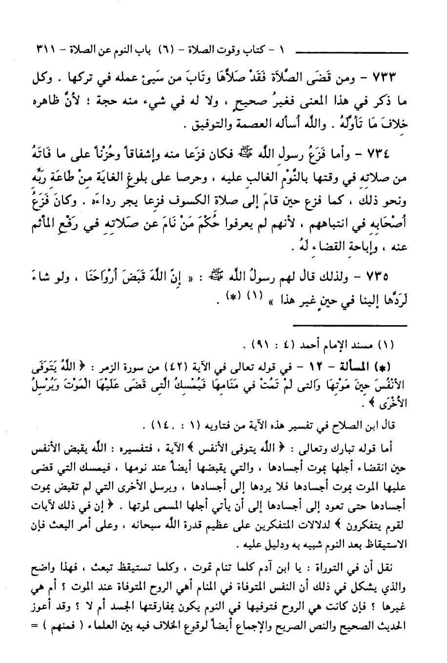 733 - وَمَنْ قَضَى الصَّلَاةَ فَقَدْ صَلَّاهَا وَتَابَ مِنْ سَيِّئِ عَمَلِهِ فِي تَرْكِهَا، وَكُلُّ مَا ذَكَرَ فِي هَذَا الْمَعْنَى فَغَيْرُ صَحِيحٍ، وَلَا لَهُ فِي شَيْءٍ مِنْهُ حُجَّةٌ ; لِأَنَّ ظَاهِرَهُ خِلَافُ مَا تَأَوَّلَهُ. وَاللَّهَ أَسْأَلُهُ الْعِصْمَةَ وَالتَّوْفِيقَ.