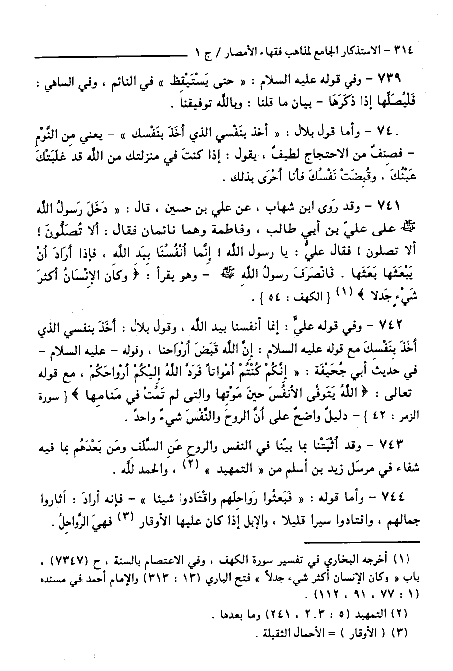 742 - وَفِي قَوْلِ عَلِيٍّ: إِنَّمَا أَنْفُسُنَا بِيَدِ اللَّهِ، وَقَوْلِ بِلَالٍ: أَخَذَ بِنَفْسِي الَّذِي أَخَذَ بِنَفْسِكَ، مَعَ قَوْلِهِ - عَلَيْهِ السَّلَامُ -: إِنَّ اللَّهَ قَبَضَ أَرْوَاحَنَا، وَقَوْلِهِ - عَلَيْهِ السَّلَامُ - فِي حَدِيثِ أَبِي جُحَيْفَةَ: " إِنَّكُمْ كُنْتُمْ أَمْوَاتًا فَرَدَّ اللَّهُ إِلَيْكُمْ أَرْوَاحَكُمْ " مَعَ قَوْلِهِ تَعَالَى: " اللَّهُ يَتَوَفَّى الْأَنْفُسَ حِينَ مَوْتِهَا وَالَّتِي لَمْ تَمُتْ فِي مَنَامِهَا " ( الزَّمْرِ: 42 ) - دَلِيلٌ وَاضِحٌ عَلَى أَنَّ الرُّوحَ وَالنَّفْسَ شَيْءٌ وَاحِدٌ.