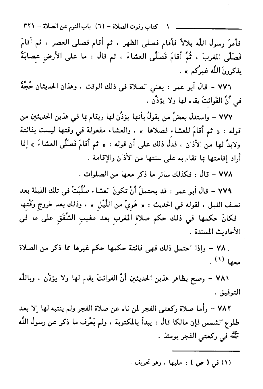776 - قَالَ أَبُو عُمَرَ: يَعْنِي الصَّلَاةَ فِي ذَلِكَ الْوَقْتِ، وَهَذَانِ الْحَدِيثَانِ حُجَّةٌ فِي أَنَّ الْفَوَائِتَ يُقَامُ لَهَا وَلَا يُؤَذَّنُ.