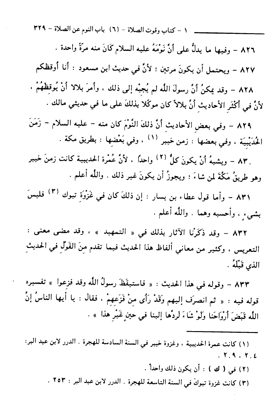 829 - وَفِي بَعْضِ الْأَحَادِيثِ أَنَّ ذَلِكَ النَّوْمَ كَانَ مِنْهُ - عَلَيْهِ السَّلَامُ - زَمَنَ الْحُدَيْبِيَةِ، وَفِي بَعْضِهَا: زَمَنَ خَيْبَرَ، وَفِي بَعْضِهَا: بِطَرِيقِ مَكَّةَ.