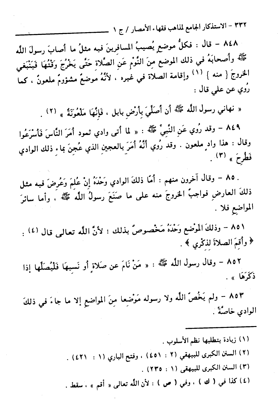848 - قَالَ: فَكُلُّ مَوْضِعٍ يُصِيبُ الْمُسَافِرِينَ فِيهِ مِثْلُ مَا أَصَابَ رَسُولَ اللَّهِ - صَلَّى اللَّهُ عَلَيْهِ وَسَلَّمَ - وَأَصْحَابَهُ فِي ذَلِكَ الْمَوْضِعِ مِنَ النَّوْمِ عَنِ الصَّلَاةِ حَتَّى يَخْرُجَ وَقْتُهَا فَيَنْبَغِي الْخُرُوجُ ( مِنْهُ ) وَإِقَامَةُ الصَّلَاةِ فِي غَيْرِهِ ; لِأَنَّهُ مَوْضِعٌ مَشْؤُومٌ مَلْعُونٌ، كَمَا رُوِيَ عَنْ عَلِيٍّ قَالَ: "نَهَانِي رَسُولُ اللَّهِ - صَلَّى اللَّهُ عَلَيْهِ وَسَلَّمَ - أَنْ أُصَلِّيَ بِأَرْضِ بَابِلَ ; فَإِنَّهَا مَلْعُونَةٌ ".