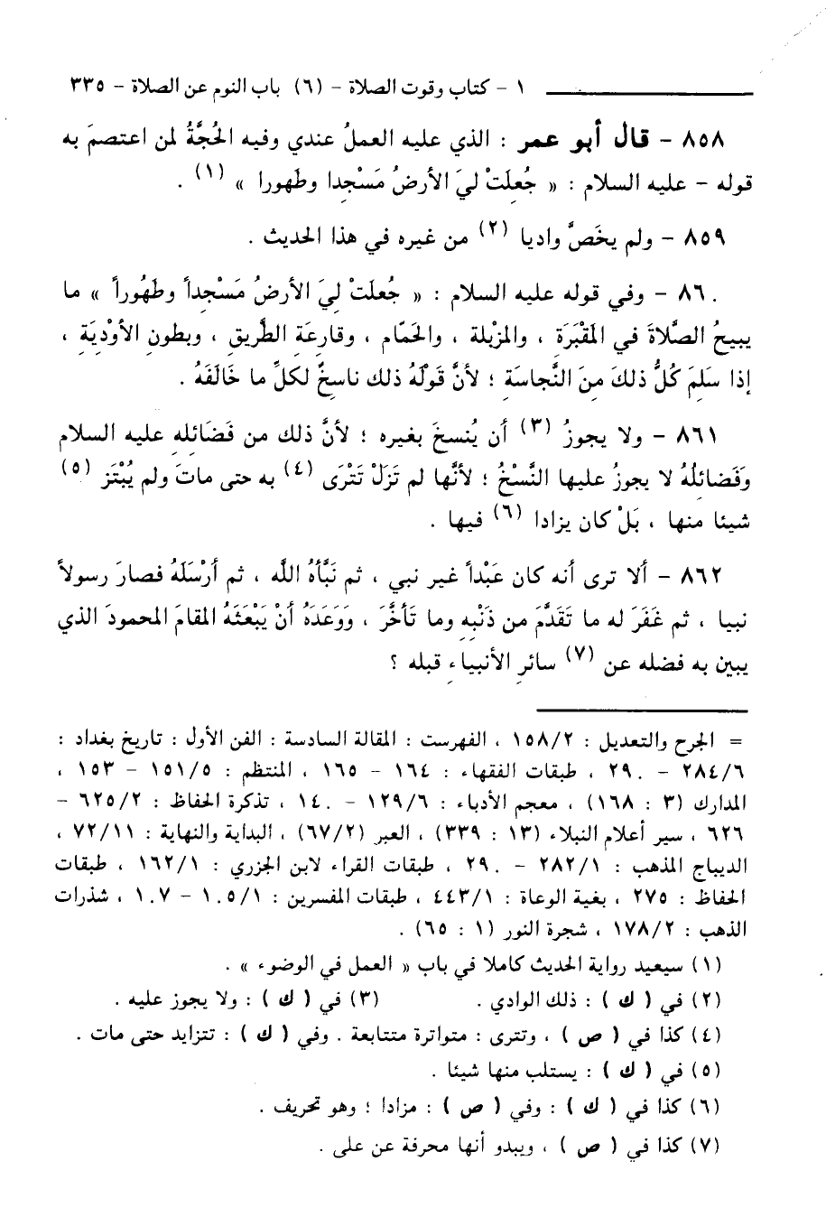 858 - قَالَ أَبُو عُمَرَ: الَّذِي عَلَيْهِ الْعَمَلُ عِنْدِي وَفِيهِ الْحُجَّةُ لِمَنِ اعْتَصَمَ بِهِ قَوْلُهُ - عَلَيْهِ السَّلَامُ -: "جُعِلَتْ لِيَ الْأَرْضُ مَسْجِدًا وَطَهُورًا ".