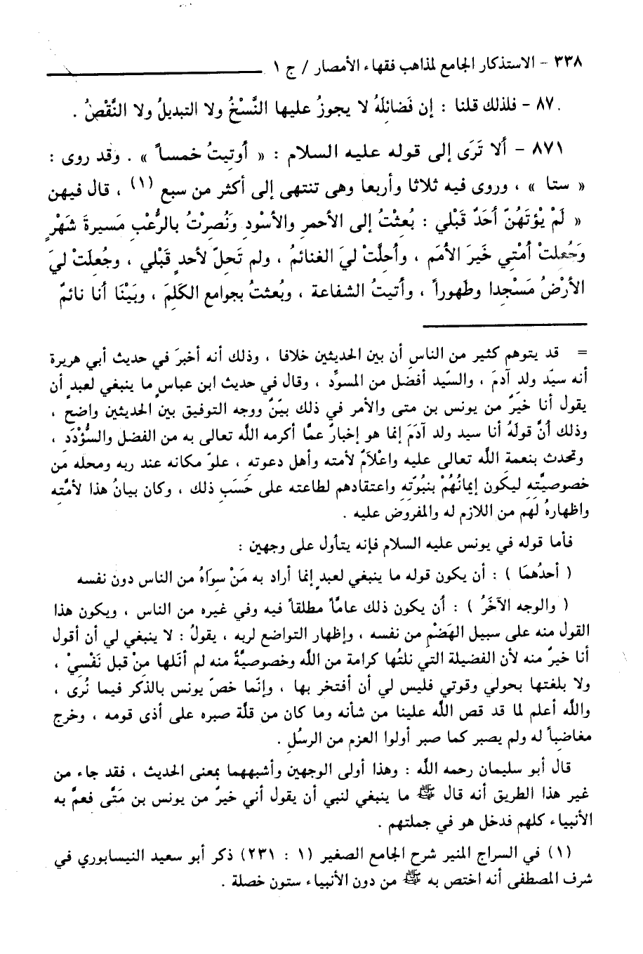 871 - أَلَا تَرَى إِلَى قَوْلِهِ - عَلَيْهِ السَّلَامُ - " أُوتِيتُ خَمْسًا " وَقَدْ رُوِيَ " سِتًّا " وَرُوِيَ فِيهِ ( ثَلَاثًا ) وَ ( أَرْبَعًا ) وَهِيَ تَنْتَهِي إِلَى أَكْثَرِ مِنْ سَبْعٍ قَالَ: فِيهِنَّ: "لَمْ يُؤْتَهُنَّ أَحَدٌ قَبْلِي: بُعِثْتُ إِلَى الْأَحْمَرِ وَالْأَسْوَدِ، وَنُصِرْتُ بِالرُّعْبِ مَسِيرَةَ شَهْرٍ، وَجُعِلَتْ أُمَّتِي خَيْرَ الْأُمَمِ، وَأُحِلَّتْ لِيَ الْغَنَائِمُ لَمْ تَحِلَّ لِأَحَدٍ قَبْلِي، وَجُعِلَتْ لِيَ الْأَرْضُ مَسْجِدًا وَطَهُورًا، وَأُتِيتُ الشَّفَاعَةُ، وَبُعِثْتُ بِجَوَامِعِ الْكَلِمِ، وَبَيْنَا أَنَا نَائِمٌ