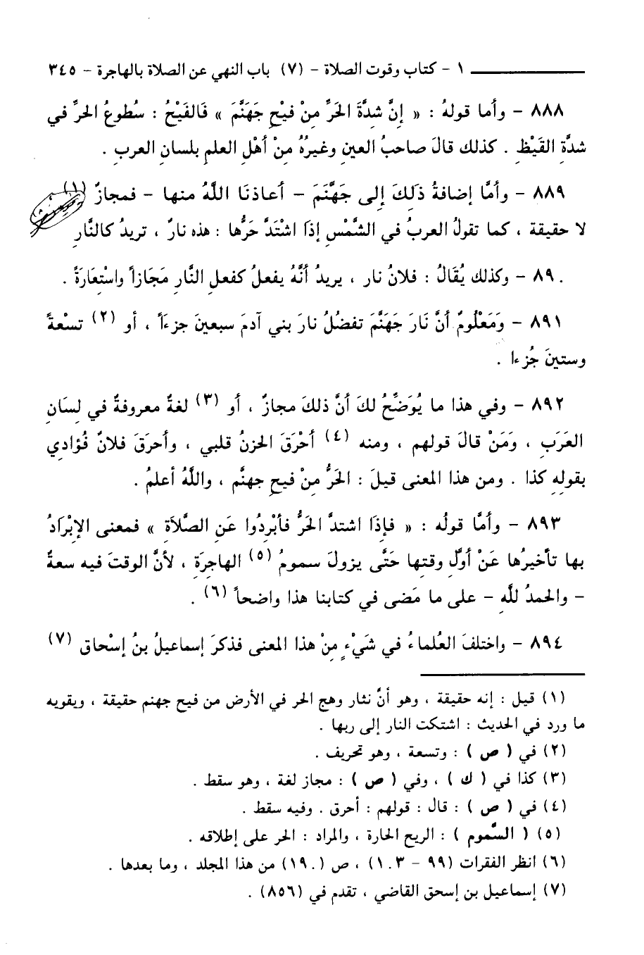 889 - وَأَمَّا إِضَافَةُ ذَلِكَ إِلَى جَهَنَّمَ - أَعَاذَنَا اللَّهُ مِنْهَا - فَمَجَازٌ لَا حَقِيقَةٌ، كَمَا تَقُولُ الْعَرَبُ فِي الشَّمْسِ إِذَا اشْتَدَّ حَرُّهَا: هَذِهِ نَارٌ، تُرِيدُ كَالنَّارِ.