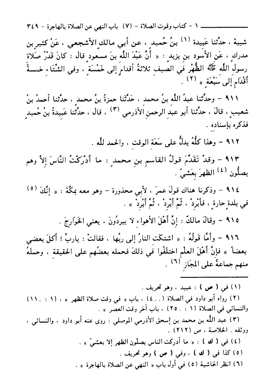 شَيْبَةَ، حَدَّثَنَا عُبَيْدَةُ بْنُ حُمَيْدٍ، عَنْ أَبِي مَالِكٍ الْأَشْجَعِيِّ، عَنْ كَثِيرِ بْنِ مُدْرِكٍ، عَنِ الْأَسْوَدِ بْنِ يَزِيدَ: " أَنَّ عَبْدَ اللَّهِ بْنَ مَسْعُودٍ قَالَ: كَانَ قَدْرُ صَلَاةِ رَسُولِ اللَّهِ - صَلَّى اللَّهُ عَلَيْهِ وَسَلَّمَ - الظُّهْرَ فِي الصَّيْفِ ثَلَاثَةَ أَقْدَامٍ إِلَى خَمْسَةٍ، وَفِي الشِّتَاءِ خَمْسَةَ أَقْدَامٍ إِلَى سَبْعَةٍ ".