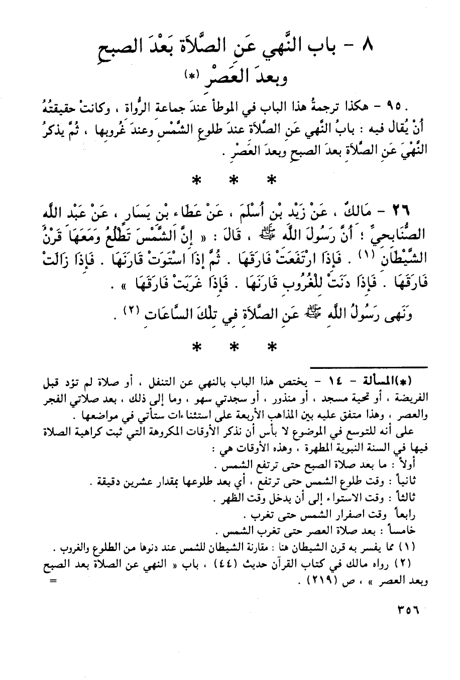 950 - هَكَذَا تَرْجَمَةُ هَذَا الْبَابِ فِي الْمُوَطَّأِ عِنْدَ جَمَاعَةِ الرُّوَاةِ، وَكَانَتْ حَقِيقَتُهُ أَنْ يُقَالَ فِيهِ: بَابُ النَّهْيِ عَنِ الصَّلَاةِ عِنْدَ طُلُوعِ الشَّمْسِ وَعِنْدَ غُرُوبِهَا، ثُمَّ يَذْكُرُ النَّهْيَ عَنِ الصَّلَاةِ بَعْدَ الصُّبْحِ وَبَعْدَ الْعَصْرِ.