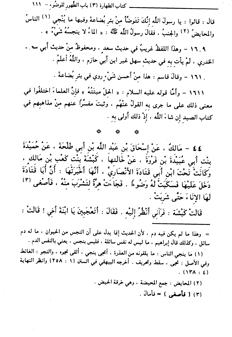 44 - مَالِكٌ، عَنْ إِسْحَاقَ بْنِ عَبْدِ اللَّهِ بْنِ أَبِي طَلْحَةَ، عَنْ حُمَيْدَةَ بِنْتِ أَبِي عُبَيْدَةَ بْنِ فَرْوَةَ، عَنْ خَالَتِهَا كَبْشَةَ بِنْتِ كَعْبِ بْنِ مَالِكٍ، وَكَانَتْ تَحْتَ ابْنِ أَبِي قَتَادَةَ الْأَنْصَارِيِّ، أَنَّهَا أَخْبَرَتْهَا: أَنَّ أَبَا قَتَادَةَ دَخَلَ عَلَيْهَا فَسَكَبَتْ لَهُ وَضُوءًا. فَجَاءَتْ هِرَّةٌ لِتَشْرَبَ مِنْهُ، فَأَصْغَى لَهَا الْإِنَاءَ حَتَّى شَرِبَتْ. قَالَتْ كَبْشَةُ: فَرَآنِي أَنْظُرُ إِلَيْهِ. فَقَالَ: أَتَعْجَبِينَ يَا ابْنَةَ أَخِي ؟ قَالَتْ: