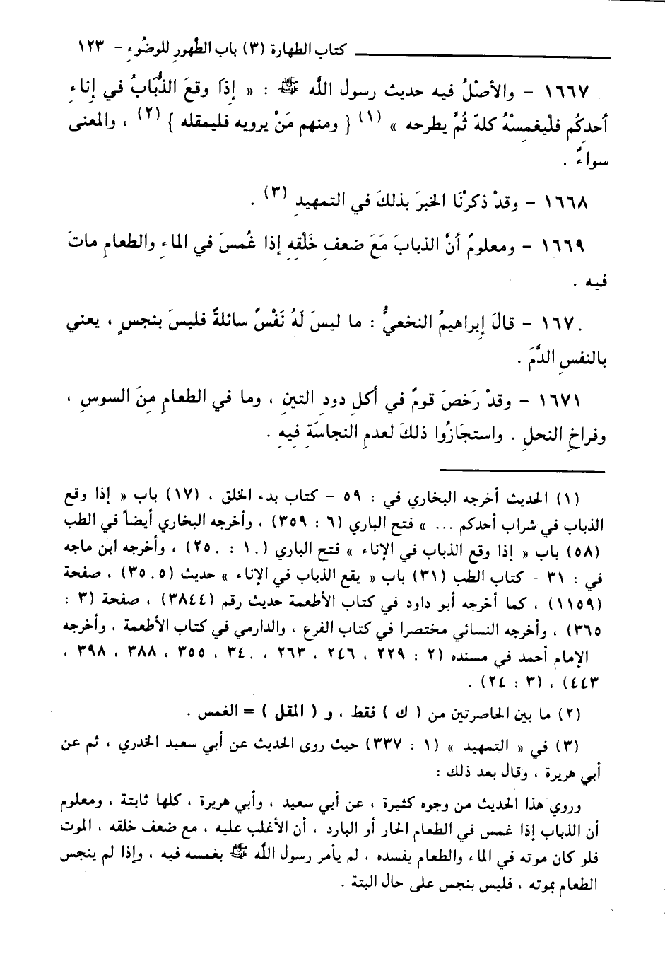 1670 - قَالَ إِبْرَاهِيمُ النَّخَعِيُّ: مَا لَيْسَ لَهُ نَفْسٌ سَائِلَةٌ فَلَيْسَ بِنَجِسٍ، يَعْنِي بِالنَّفْسِ الدَّمَ.