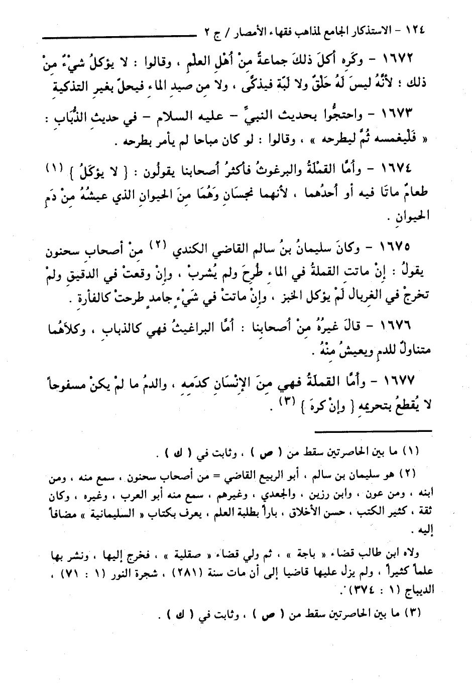 1675 - وَكَانَ سُلَيْمَانُ بْنُ سَالِمٍ الْقَاضِي الْكِنْدِيُّ مِنْ أَصْحَابِ سَحْنُونَ يَقُولُ: إِنْ مَاتَتِ الْقَمْلَةُ فِي الْمَاءِ طُرِحَ وَلَمْ يُشْرَبْ، وَإِنْ وَقَعَتْ فِي الدَّقِيقِ وَلَمْ تَخْرُجْ فِي الْغِرْبَالِ لَمْ يُؤْكَلِ الْخُبْزُ، وَإِنْ مَاتَتْ فِي شَيْءٍ جَامِدٍ طُرِحَتْ كَالْفَأْرَةِ.