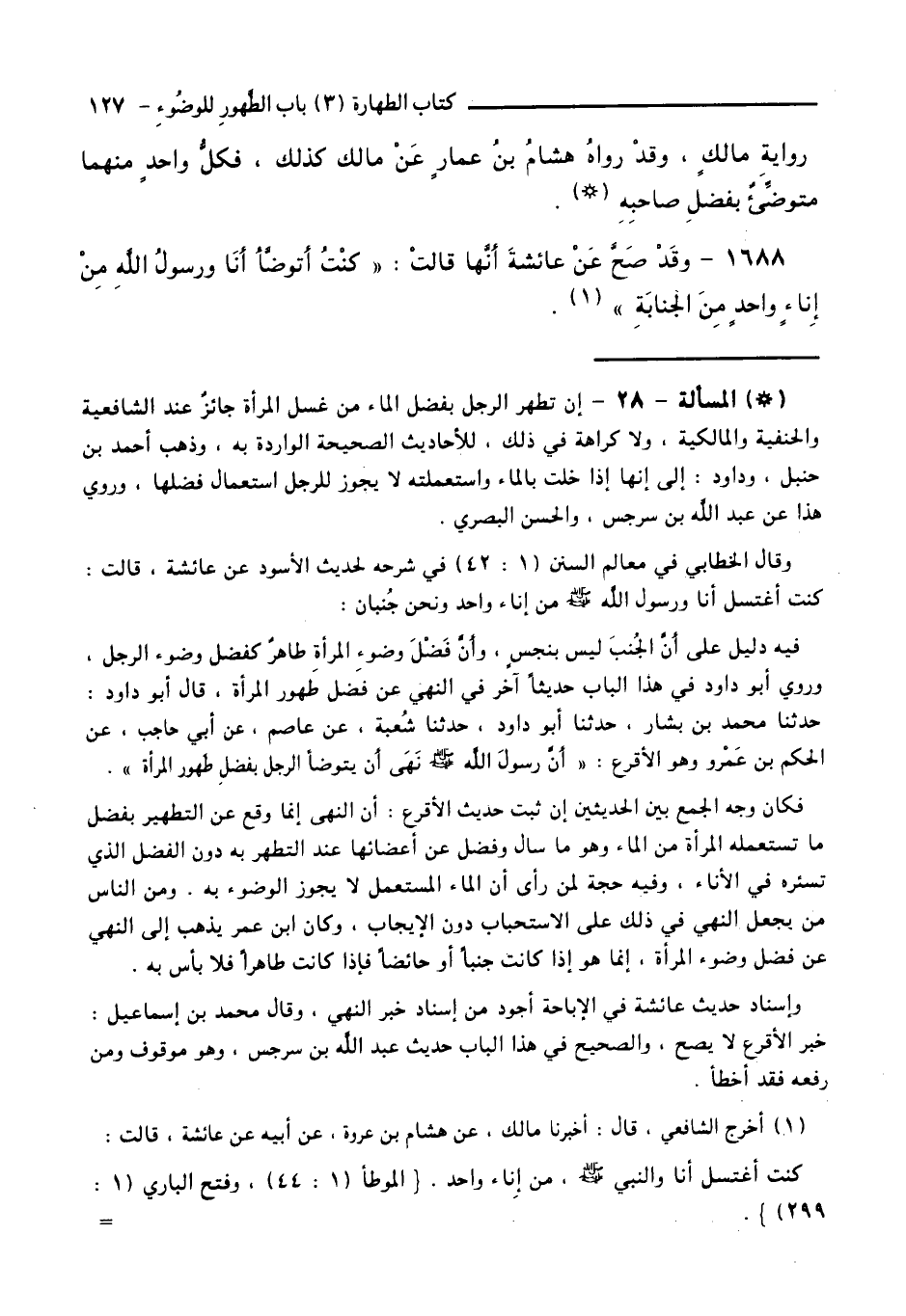 رِوَايَةِ مَالِكٍ، وَقَدْ رَوَاهُ هِشَامُ بْنُ عَمَّارٍ عَنْ مَالِكٍ كَذَلِكَ، فَكُلُّ وَاحِدٍ مِنْهُمَا مُتَوَضِّئٌ بِفَضْلِ صَاحِبِهِ.