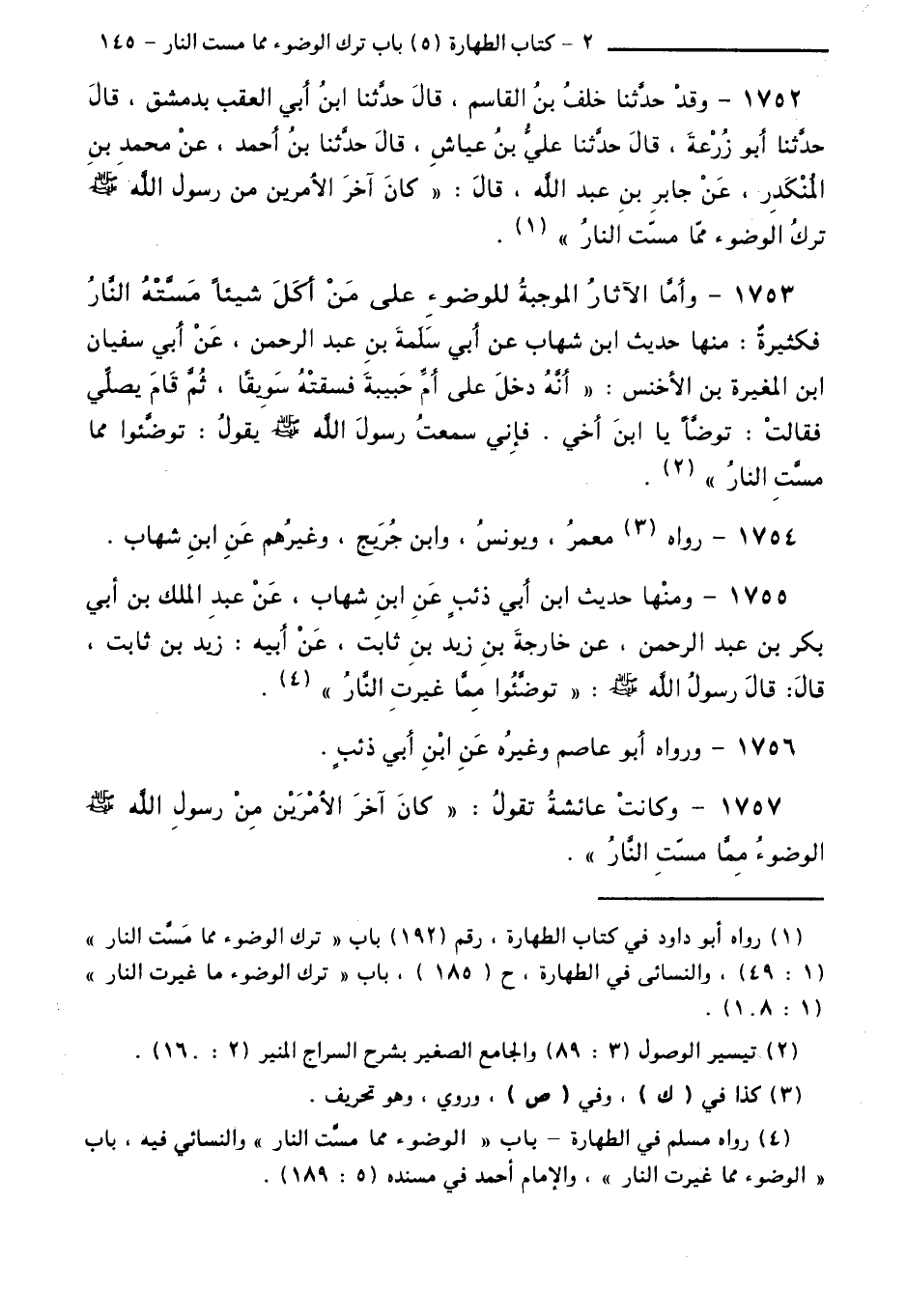 1757 - وَكَانَتْ عَائِشَةُ تَقُولُ: "كَانَ آخِرَ الْأَمْرَيْنِ مِنْ رَسُولِ اللَّهِ - صَلَّى اللَّهُ عَلَيْهِ وَسَلَّمَ - الْوُضُوءُ مِمَّا مَسَّتِ النَّارُ ".