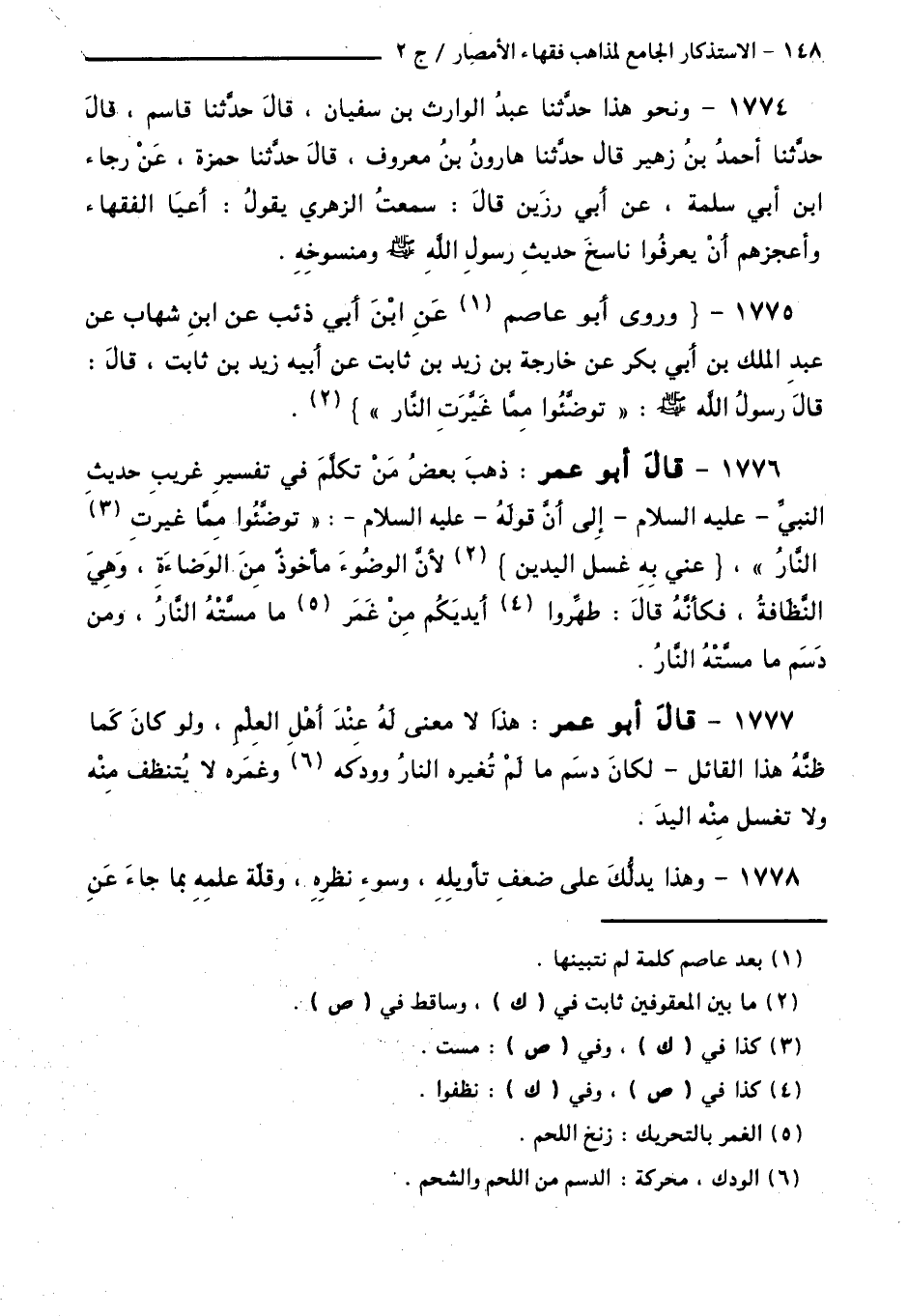1777 - قَالَ أَبُو عُمَرَ: هَذَا لَا مَعْنَى لَهُ عِنْدَ أَهْلِ الْعِلْمِ، وَلَوْ كَانَ كَمَا ظَنَّهُ هَذَا الْقَائِلُ - لَكَانَ دَسَمُ مَا لَمْ تُغَيِّرْهُ النَّارُ وَوَدَكُهُ وَغَمَرُهُ لَا يُتَنَظَّفُ مِنْهُ وَلَا تُغْسَلُ مِنْهُ الْيَدُ.