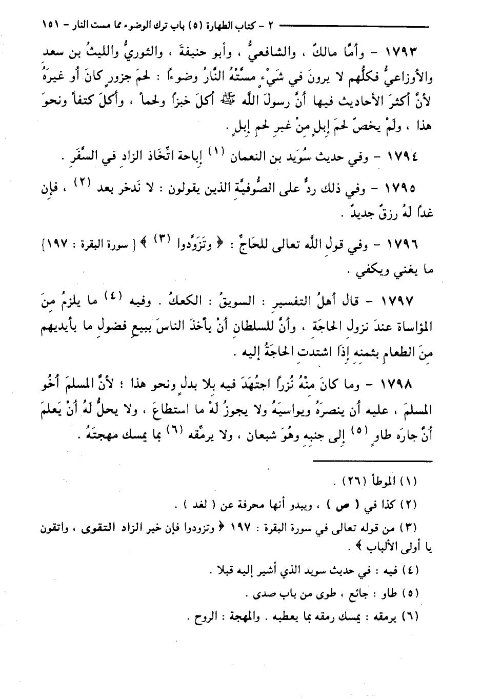 1793 - وَأَمَّا مَالِكٌ، وَالشَّافِعِيُّ، وَأَبُو حَنِيفَةَ، وَالثَّوْرِيُّ، وَاللَّيْثُ بْنُ سَعْدٍ، وَالْأَوْزَاعِيُّ فَكُلُّهُمْ لَا يَرَوْنَ فِي شَيْءٍ مَسَّتْهُ النَّارُ وَضُوءًا: لَحْمَ جَزُورٍ كَانَ أَوْ غَيْرَهُ لِأَنَّ أَكْثَرَ الْأَحَادِيثِ فِيهَا أَنَّ رَسُولَ اللَّهِ - صَلَّى اللَّهُ عَلَيْهِ وَسَلَّمَ - أَكَلَ خُبْزًا وَلَحْمًا، وَأَكَلَ كَتِفًا وَنَحْوَ هَذَا، وَلَمْ يَخُصَّ لَحْمَ إِبِلٍ مِنْ غَيْرِ لَحْمِ إِبِلٍ.