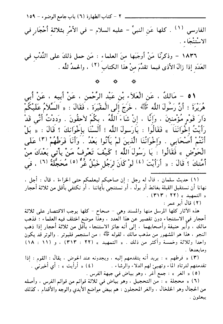 51 - مَالِكٌ، عَنِ الْعَلَاءِ بْنِ عَبْدِ الرَّحْمَنِ، عَنْ أَبِيهِ، عَنْ أَبِي هُرَيْرَةَ ؛أَنَّ رَسُولَ اللَّهِ - صَلَّى اللَّهُ عَلَيْهِ وَسَلَّمَ - خَرَجَ إِلَى الْمَقْبَرَةِ، فَقَالَ: " السَّلَامُ عَلَيْكُمْ دَارَ قَوْمٍ مُؤْمِنِينَ، وَإِنَّا، إِنْ شَاءَ اللَّهُ بِكُمْ لَاحِقُونَ، وَدِدْتُ أَنِّي قَدْ رَأَيْتُ إِخْوَانَنَا " فَقَالُوا: يَا رَسُولَ اللَّهِ ! أَلَسْنَا بِإِخْوَانِكَ ؟ قَالَ: " بَلْ أَنْتُمْ أَصْحَابِي. وَإِخْوَانُنَا الَّذِينَ لَمْ يَأْتُوا بَعْدُ. وَأَنَا فَرَطُهُمْ عَلَى الْحَوْضِ " فَقَالُوا: يَا رَسُولَ اللَّهِ ! كَيْفَ تَعْرِفُ مَنْ يَأْتِي بَعْدَكَ مِنْ أُمَّتِكَ ؟ قَالَ: " أَرَأَيْتَ لَوْ كَانَ لِرَجُلٍ خَيْلٌ غُرٌ مُحَجَّلَةٌ، فِي