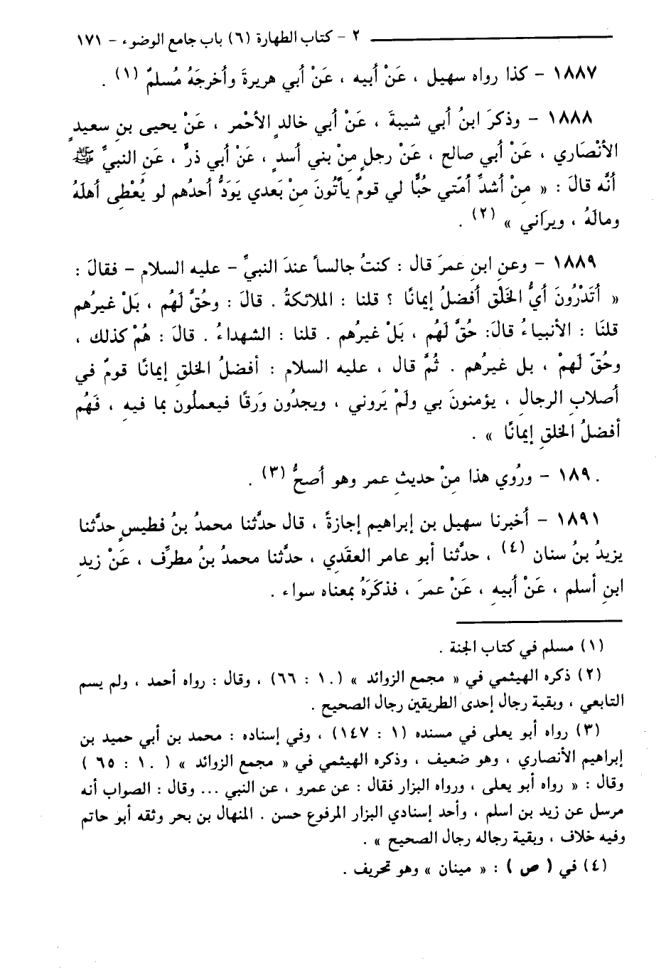1889 - وَعَنِ ابْنِ عُمَرَ قَالَ: كُنْتُ جَالِسًا عِنْدَ النَّبِيِّ - عَلَيْهِ السَّلَامُ - فَقَالَ: " أَتَدْرُونَ أَيُّ الْخَلْقِ أَفْضَلُ إِيمَانًا ؟ قُلْنَا: الْمَلَائِكَةُ. قَالَ: وَحُقَّ لَهُمْ، بَلْ غَيْرُهُمْ قُلْنَا: الْأَنْبِيَاءُ. قَالَ: حُقَّ لَهُمْ بَلْ غَيْرُهُمْ. قُلْنَا: الشُّهَدَاءُ. قَالَ: هُمْ كَذَلِكَ، وَحُقَّ لَهُمْ بَلْ غَيْرُهُمْ. ثُمَّ قَالَ، عَلَيْهِ السَّلَامُ: أَفْضَلُ الْخَلْقِ إِيمَانًا قَوْمٌ فِي أَصْلَابِ الرِّجَالِ، يُؤْمِنُونَ بِي وَلَمْ يَرَوْنِي، وَيَجِدُونَ وَرَقًا فَيَعْمَلُونَ بِمَا فِيهِ، فَهُمْ أَفْضَلُ الْخَلْقِ إِيمَانًا ".
