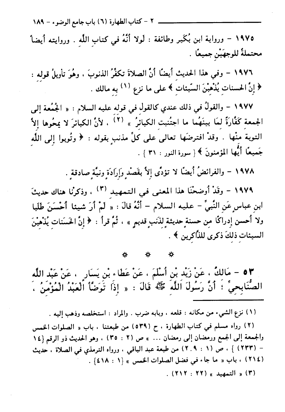 1977 - وَالْقَوْلُ فِي ذَلِكَ عِنْدِي كَالْقَوْلِ فِي قَوْلِهِ - عَلَيْهِ السَّلَامُ -: "الْجُمُعَةُ إِلَى الْجُمُعَةِ كَفَّارَةٌ لِمَا بَيْنَهُمَا مَا اجْتُنِبَتِ الْكَبَائِرُ " ؛ لِأَنَّ الْكَبَائِرَ لَا يَمْحُوهَا إِلَّا التَّوْبَةُ مِنْهَا. وَقَدِ افْتَرَضَهَا تَعَالَى عَلَى كُلِّ مُذْنِبٍ بِقَوْلِهِ: "وَتُوبُوا إِلَى اللَّهِ جَمِيعًا أَيُّهَا الْمُؤْمِنُونَ " [ النُّورِ: 31 ].