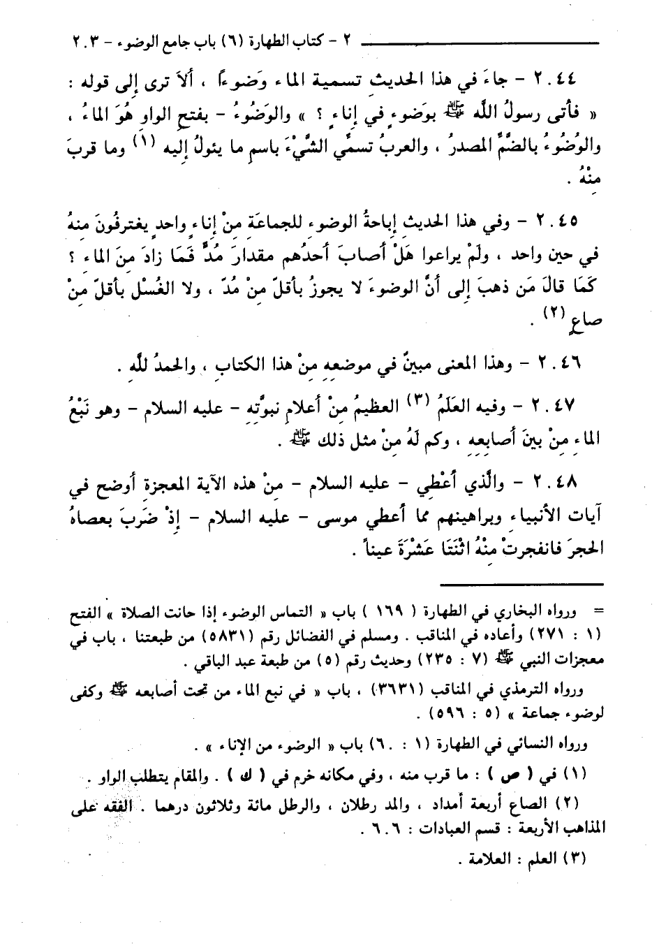 2045 - وَفِي هَذَا الْحَدِيثِ إِبَاحَةُ الْوُضُوءِ لِلْجَمَاعَةِ مِنْ إِنَاءٍ يَغْتَرِفُونَ مِنْهُ فِي حِينٍ وَاحِدٍ، وَلَمْ يُرَاعُوا هَلْ أَصَابَ أَحَدُهُمْ مِقْدَارَ مُدٍّ فَمَا زَادَ مِنَ الْمَاءِ ؟ كَمَا قَالَ: مَنْ ذَهَبَ إِلَى أَنَّ الْوُضُوءَ لَا يَجُوزُ بِأَقَلَّ مِنْ مُدٍّ، وَلَا الْغُسْلَ بِأَقَلَّ مِنْ صَاعٍ.