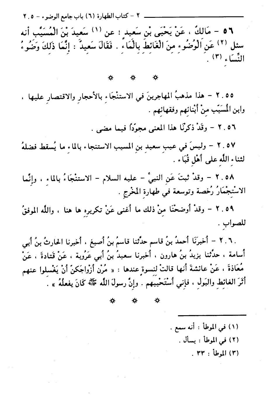 56 - مَالِكٌ، عَنْ يَحْيَى بْنِ سَعِيدٍ ؛ عَنْ سَعِيدِ بْنِ الْمُسَيَّبِ أَنَّهُ سُئِلَ عَنِ الْوُضُوءِ مِنَ الْغَائِطِ بِالْمَاءِ. فَقَالَ سَعِيدٌ: إِنَّمَا ذَلِكَ وُضُوءُ النِّسَاءِ.
