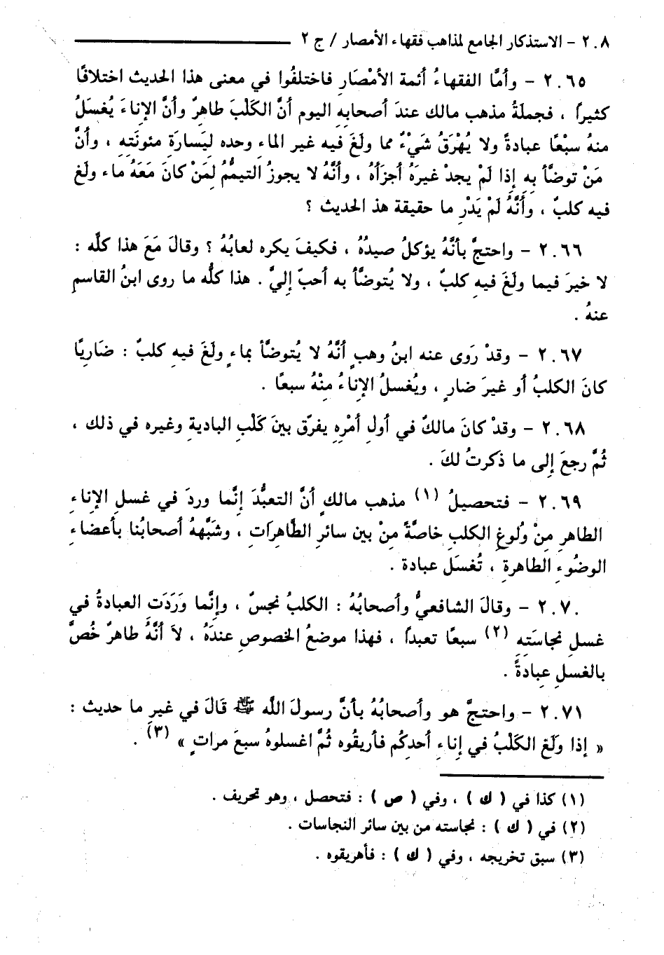 2065 - وَأَمَّا الْفُقَهَاءُ أَئِمَّةُ الْأَمْصَارِ فَاخْتَلَفُوا فِي مَعْنَى هَذَا الْحَدِيثِ اخْتِلَافًا كَثِيرًا، فَجُمْلَةُ مَذْهَبِ مَالِكٍ عِنْدَ أَصْحَابِهِ الْيَوْمَ أَنَّ الْكَلْبَ طَاهِرٌ وَأَنَّ الْإِنَاءَ يُغْسَلُ مِنْهُ سَبْعًا عِبَادَةً وَلَا يُهْرَقُ شَيْءٌ مِمَّا وَلَغَ فِيهِ غَيْرَ الْمَاءِ وَحْدَهُ لِيَسَارَةِ مَئُونَتِهِ، وَأَنَّ مَنْ تَوَضَّأَ بِهِ إِذَا لَمْ يَجِدْ غَيْرَهُ أَجْزَأَهُ، وَأَنَّهُ لَا يَجُوزُ التَّيَمُّمُ لِمَنْ كَانَ مَعَهُ مَاءٌ وَلَغَ فِيهِ كَلْبٌ، وَأَنَّهُ لَمْ يَدْرِ مَا حَقِيقَةُ هَذَا الْحَدِيثِ ؟.