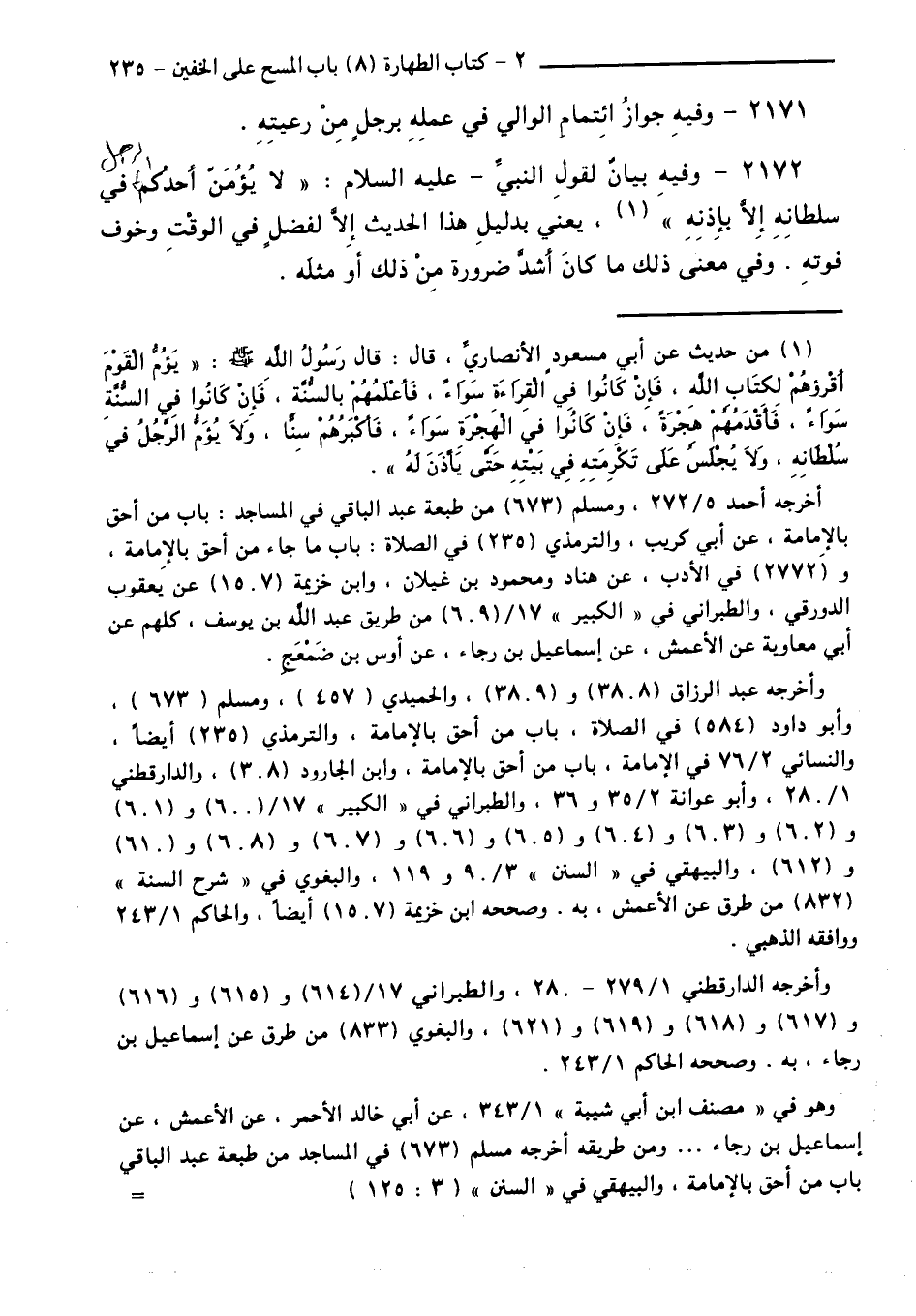 2172 - وَفِيهِ بَيَانٌ لِقَوْلِ النَّبِيِّ - عَلَيْهِ السَّلَامُ -: "لَا يُؤَمَّنَّ أَحَدُكُمْ فِي سُلْطَانِهِ إِلَّا بِإِذْنِهِ "، يَعْنِي بِدَلِيلِ هَذَا الْحَدِيثِ إِلَّا لِفَضْلٍ فِي الْوَقْتِ وَخَوْفِ فَوْتِهِ. وَفِي مَعْنَى ذَلِكَ مَا كَانَ أَشَدَّ ضَرُورَةً مِنْ ذَلِكَ أَوْ مِثْلَهُ.