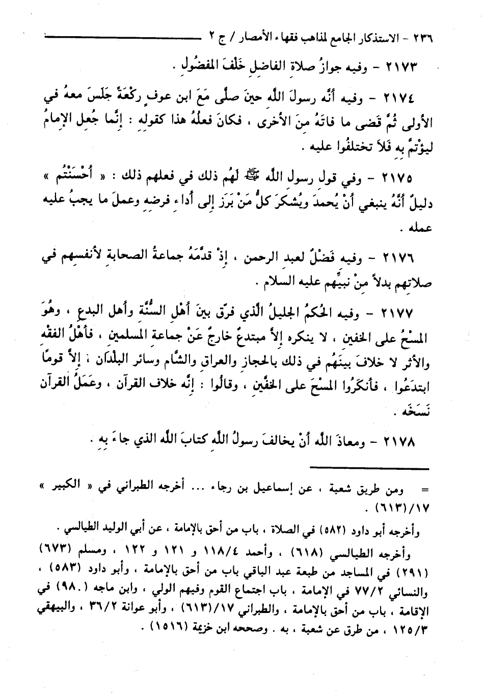 2177 - وَفِيهِ الْحُكْمُ الْجَلِيلُ الَّذِي فَرَّقَ بَيْنَ أَهْلِ السُّنَّةِ وَأَهْلِ الْبِدَعِ، وَهُوَ الْمَسْحُ عَلَى الْخُفَّيْنِ، لَا يُنْكِرُهُ إِلَّا مُبْتَدِعٌ خَارِجٌ عَنْ جَمَاعَةِ الْمُسْلِمِينَ، فَأَهْلُ الْفِقْهِ وَالْأَثَرِ لَا خِلَافَ بَيْنِهِمْ فِي ذَلِكَ بِالْحِجَازِ وَالْعِرَاقِ وَالشَّامِ وَسَائِرِ الْبُلْدَانِ، إِلَّا قَوْمًا ابْتَدَعُوا فَأَنْكَرُوا الْمَسْحَ عَلَى الْخُفَّيْنِ، وَقَالُوا: إِنَّهُ خِلَافُ الْقُرْآنِ، وَعَمَلُ الْقُرْآنِ نَسَخَهُ.
