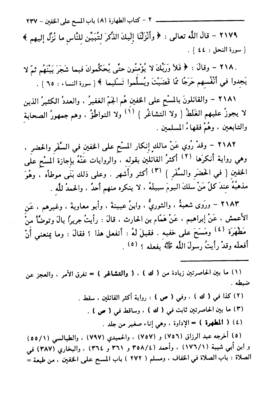 2181 - وَالْقَائِلُونَ بِالْمَسْحِ عَلَى الْخُفَّيْنِ هُمُ الْجَمُّ الْغَفِيرُ، وَالْعَدَدُ الْكَثِيرُ الَّذِينَ لَا يَجُوزُ عَلَيْهِمُ الْغَلَطُ وَلَا التَّشَاغُرُ وَلَا التَّوَاطُؤُ، وَهُمْ جُمْهُورُ الصَّحَابَةِ وَالتَّابِعِينَ، وَهُمْ فُقَهَاءُ الْمُسْلِمِينَ.